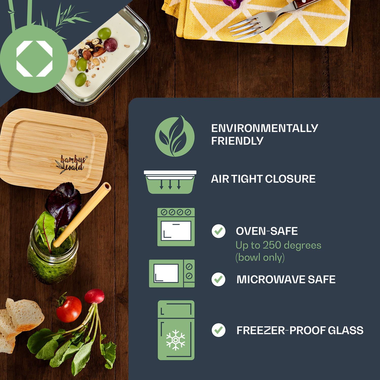 Elegantná súprava všestranných pomocníkov Klarstein bambuswald: 4 dózy na skladovanie potravín v rôznych veľkostiach. Na skladovanie potravín, syrov alebo klobásy v chladničke, na skladovanie zásob na polici alebo na zabalenie desiatej – použitie súpravy je takmer neobmedzené. Vďaka robustnému borosilikátovému sklu sú dózy vhodné dokonca na zohrievanie alebo mrazenie potravín. Vďaka tesnému bambusovému vrchnáku so silikónovým tesnením zostáva všetko pevne uzavreté a potraviny si udržia dlho svoju arómu. Praktická, udržateľná, elegantná: súprava naukladaná na seba priťahuje pozornosť na tvojej kuchynskej polici.