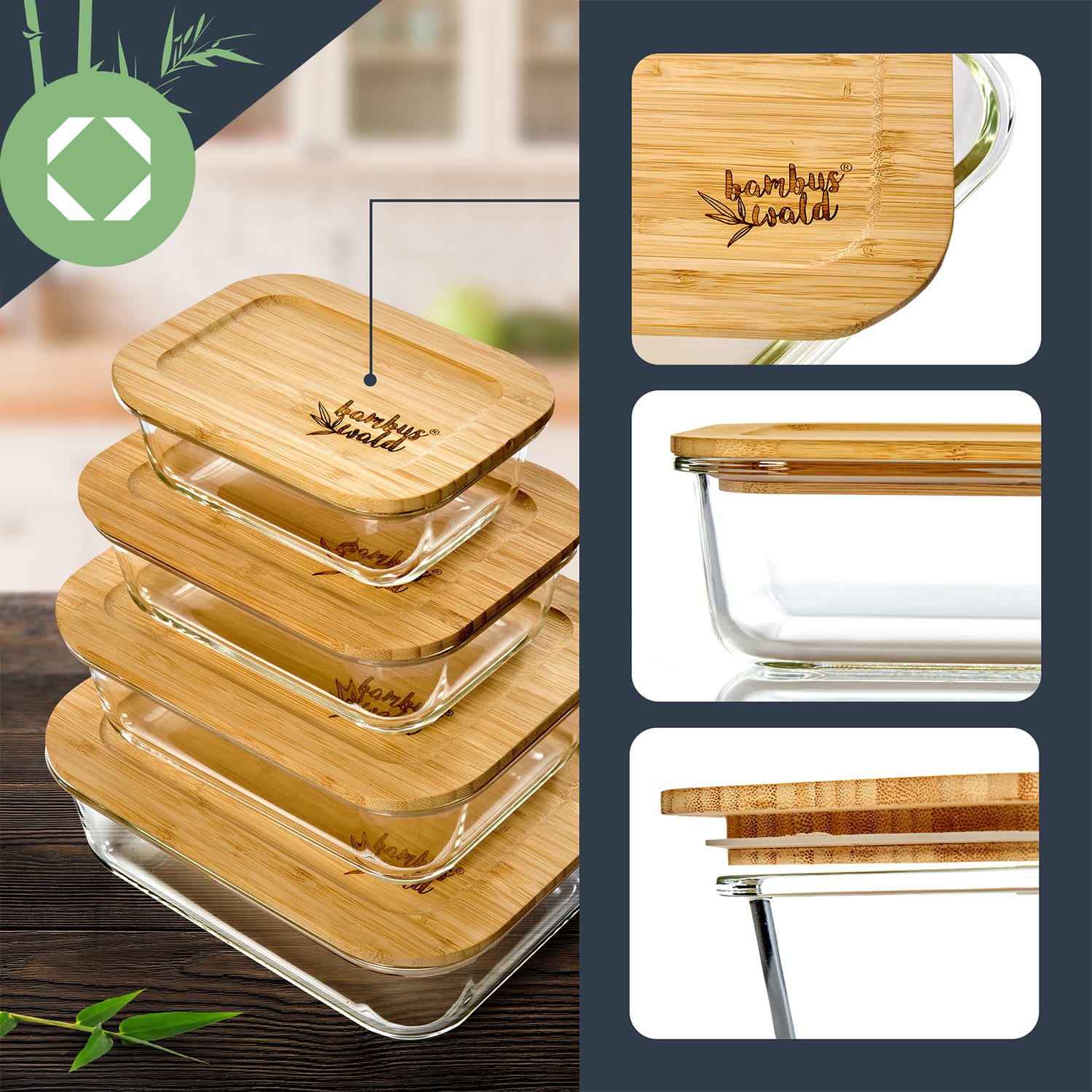 Klarstein Súprava hranatých dóz na skladovanie potravín, súprava 4 kusov, rôzne veľkosti, sklo, bambusový vrchnák – Kúpiť
