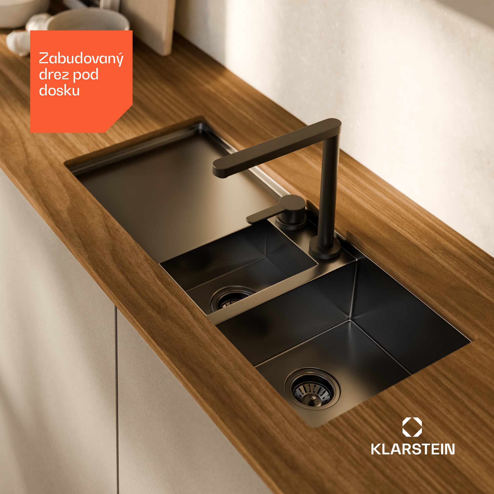 Premyslené do posledného detailu: vďaka drezu TitanSteel 1.5 od Klarstein bude umývanie riadu v hračkou. S veľkým hlavným umývadlom a praktickým menším sú taniere, panvice a hrnce v okamihu opäť čisté. Okrem dvoch umývadiel zaujme TitanSteel 1.5 aj veľkou odkvapkávacou plochou. Môžete sem umiestniť čistý riad alebo horúce hrnce a panvice z rúry. Kuchynský drez od Klarstein je vyrobený z nehrdzavejúcej ocele 304. To zaručuje mimoriadne odolný a ľahko čistiteľný povrch. Nevzhľadné škvrny od vodného kameňa sú konečne minulosťou. Takisto sa nemusíte obávať preliačenín a otlakov, ak vám hrniec spadne do drezu. Puzdro z nehrdzavejúcej ocele s hrúbkou 1 mm je mimoriadne robustné. Drez odolný voči poškriabaniu od spoločnosti Klarstein vyzerá aj pri každodennom používaní vždy ako nový.Kuchynský drez Klarstein s hlavným a vedľajším umývadlom pre spodné skrinky sa inštaluje mimoriadne jednoducho pomocou návodu na obsluhu. Dodávaná montážna súprava a priložená odtoková rúrka vám ušetria návštevu obchodu pre domácich majstrov a mimoriadne uľahčia inštaláciu. Výklenok pre batériu názorne ukazuje, že hlavné umývadlo je vždy na pravej strane. Na ochranu pred poškodením vodou je drez vybavený praktickým prepadom.