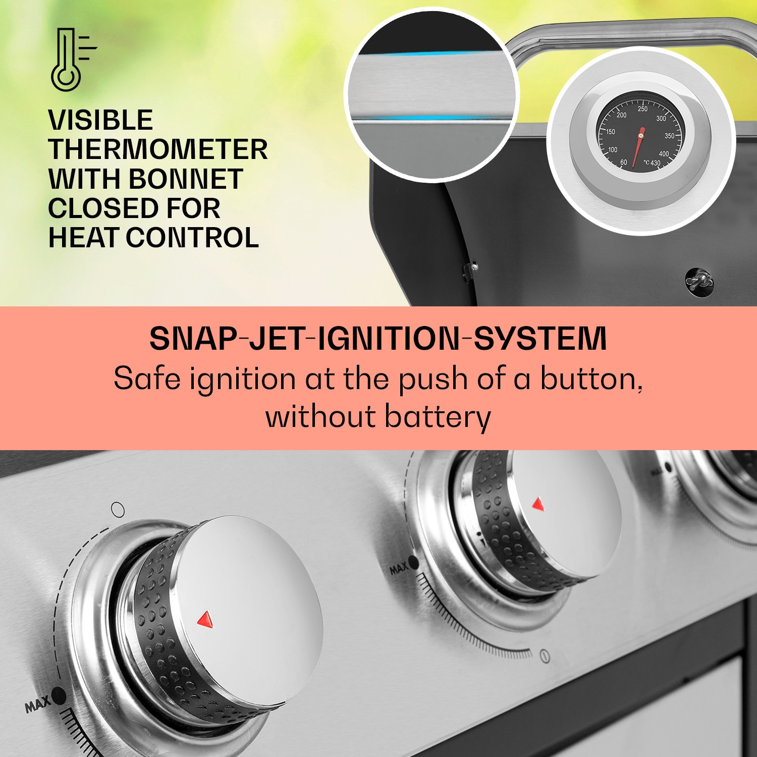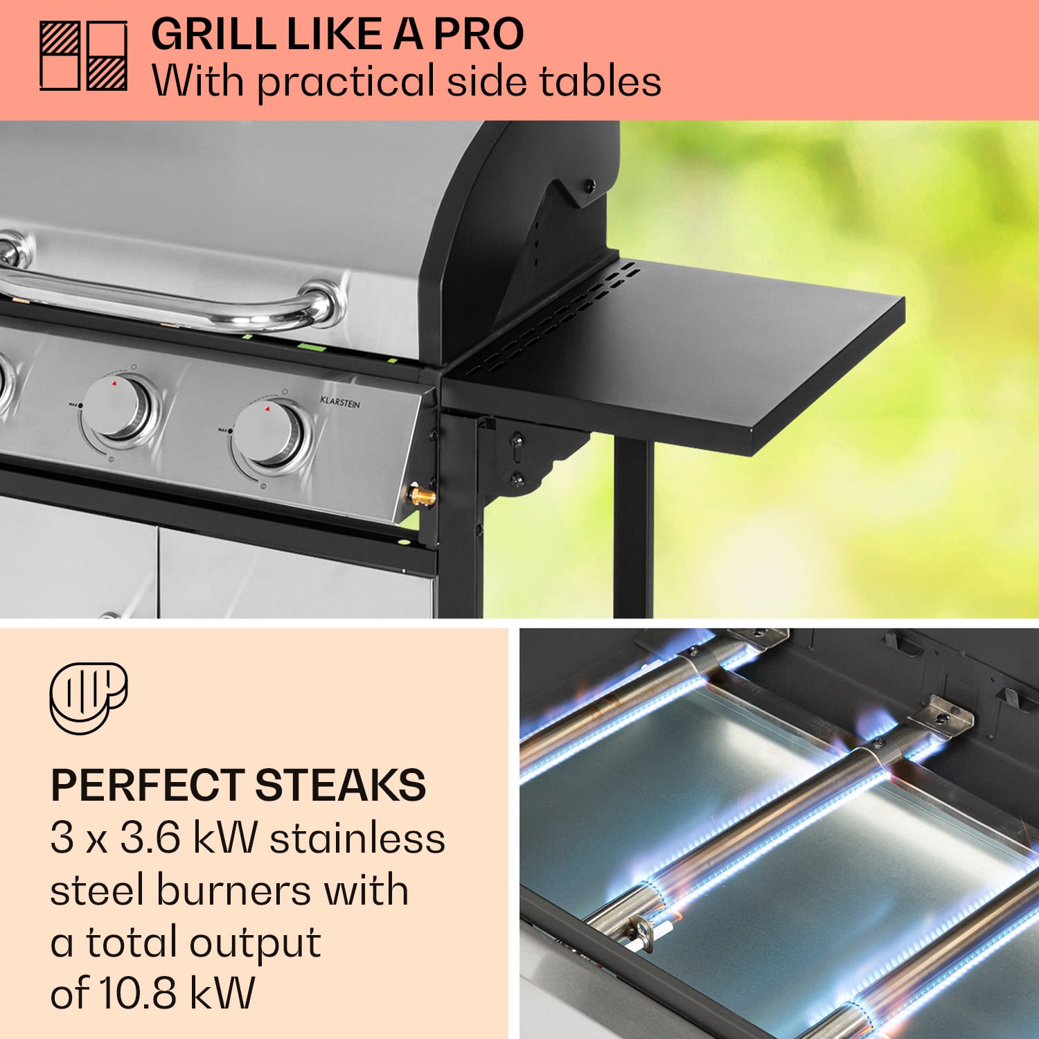 Grilovacia sezóna môže začať! Plynový gril Klarstein Tomahawk s 3 horákmi je prísľubom grilovaných špecialít tej najvyššej kvality. Vďaka veľkej grilovacej ploche, vysokému tepelnému výkonu a elegantnému dizajnu sa príprava jedla stane čistým pôžitkom. O slušné teplo pod grilom sa postarajú tri horáky, každý s výkonom 3,6 kW. Vďaka bezbatériovému piezoelektrickému zapaľovaniu sa plamene spúšťajú pohodlne a okamžite po stlačení tlačidla. Vďaka mimoriadne veľkej ploche 60 x 43,5 cm možno na grilovací rošt súčasne umiestniť výdatné steaky, chrumkavé klobásy, lahodnú grilovanú zeleninu i šťavnaté ryby. Veľká grilovacia doska zabezpečuje rovnomerné rozloženie tepla, takže aj na okrajoch grilovacej zóny sa všetko dochrumkava opečie. S veľkou dvojstennou kapotou z nehrdzavejúcej ocele nie sú problémom ani špeciality pasívneho grilovania, ako sú bravčové mäso alebo rebierka. Dve výsuvné bočné časti s rozmermi 31 x 45,5 cm poskytujú dostatok úložného priestoru aj počas grilovania – dostatok miesta na misky, panvice, príbory, nápoje alebo korenie. Okrem toho má Klarstein Tomahawk aj 3 háčiky na zavesenie grilovacích klieští, špajlí na špízy alebo obracačiek, bočnú poličku na fľaše a koreniny, ako aj smaltovanú ohrievaciu mriežku na hotové grilované jedlo – na tomto grile je jednoducho všetko po ruke!Potrebná plynová fľaša je umiestnená priamo v stojane a bezpečne upevnená popruhom. Vďaka hladkým podlahovým kolieskam s parkovacou brzdou možno gril veľmi rýchlo odložiť – takže grilovanie ostane zábavným aj nasledujúci deň!