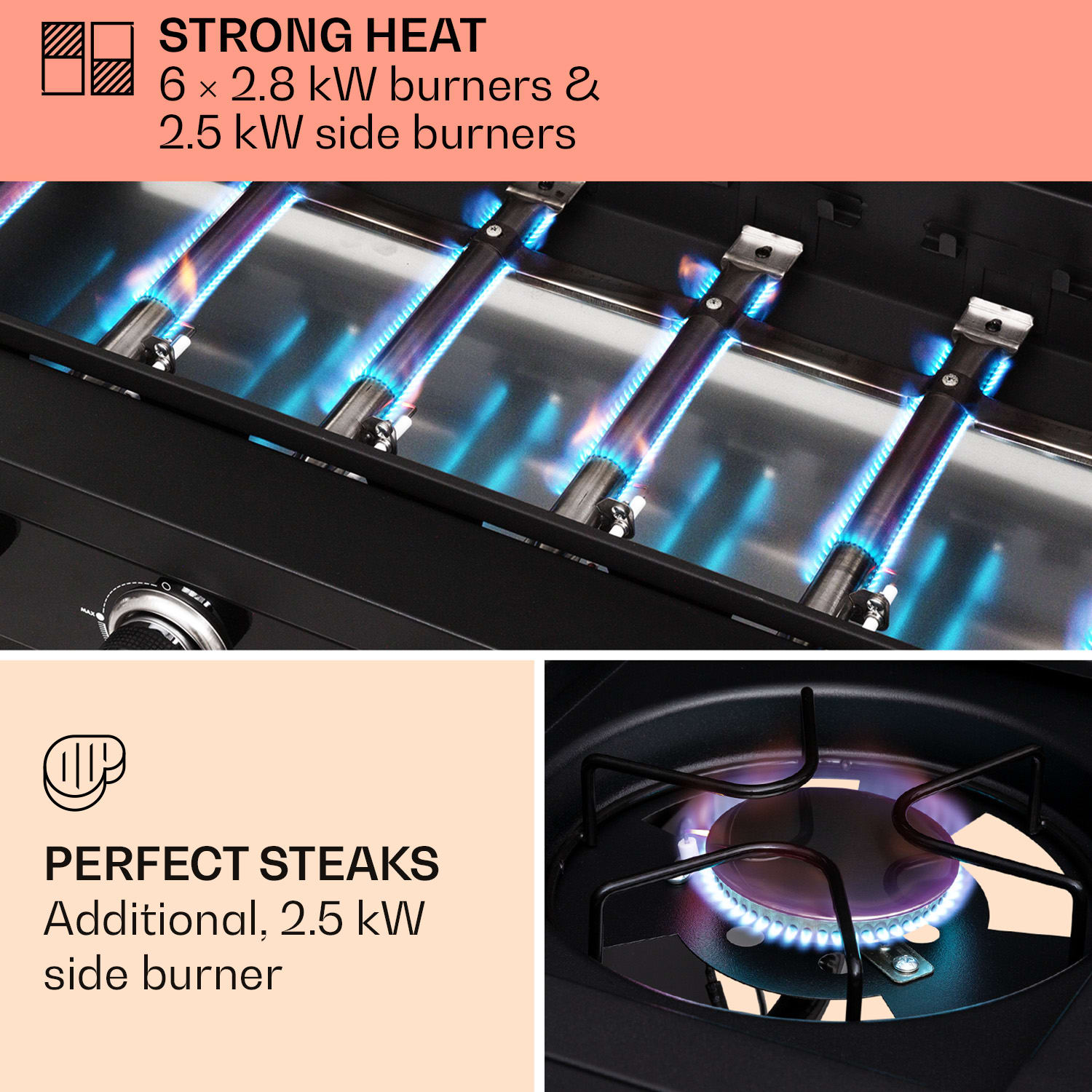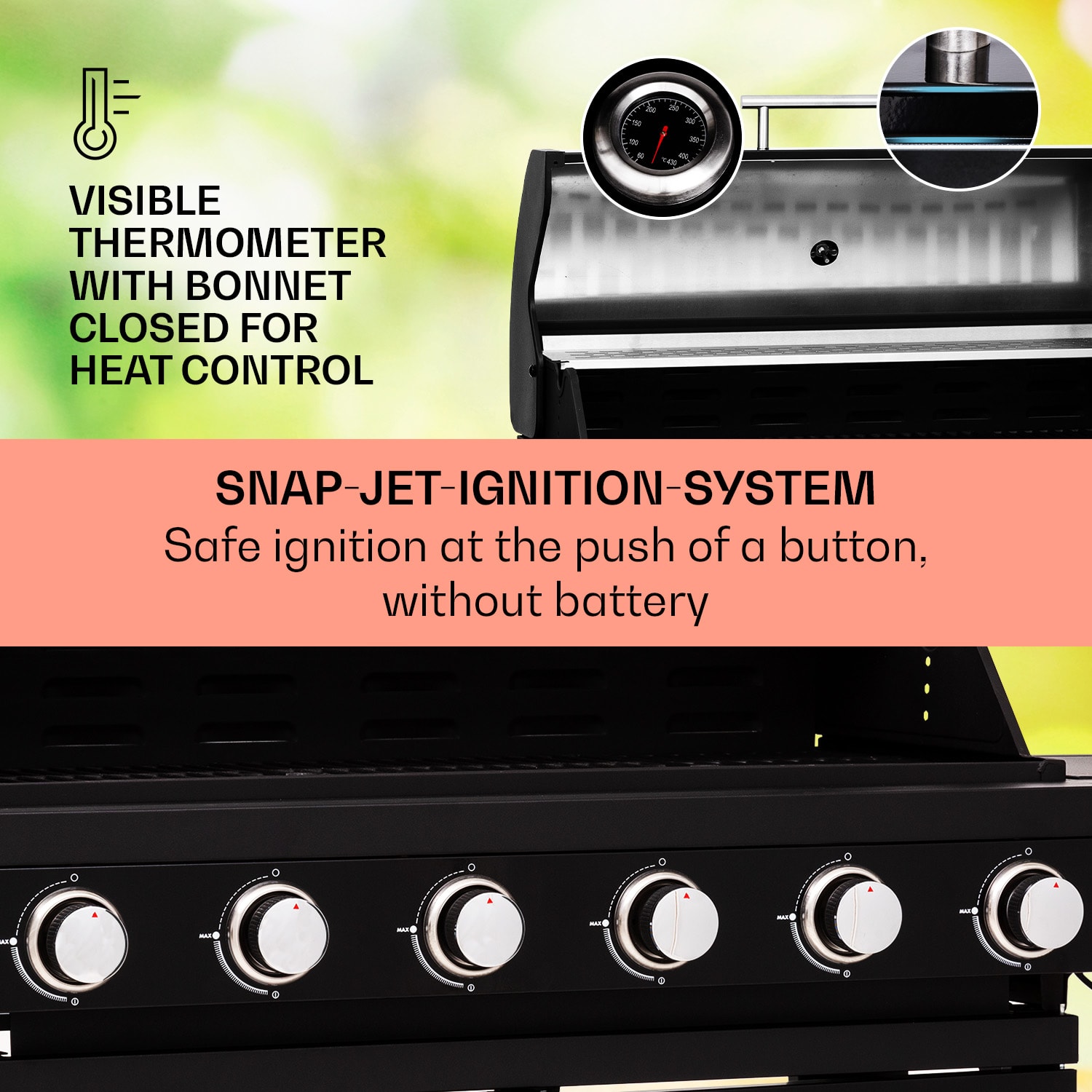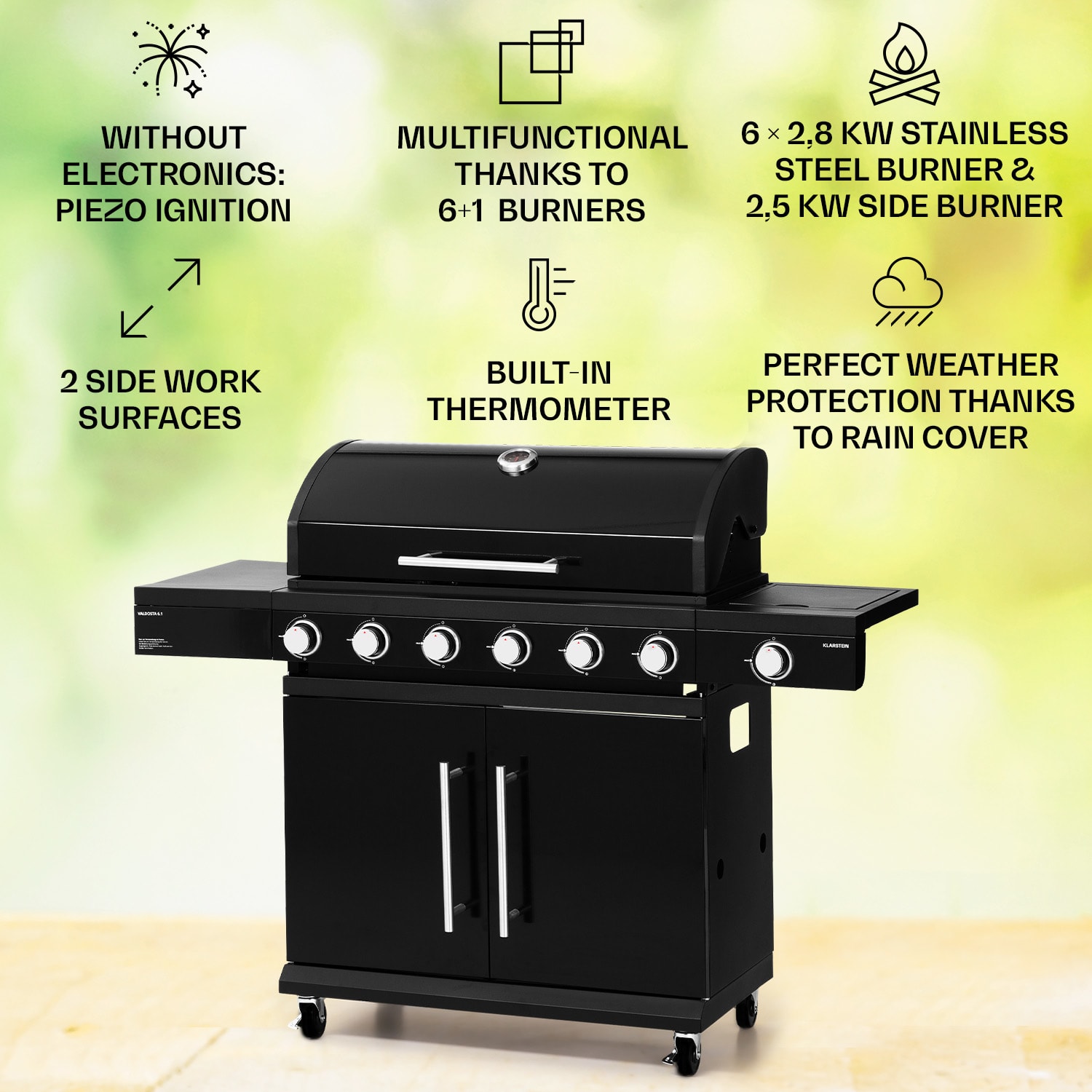 Sezóna grilovania môže prísť: plynový gril Valdosta 6.1 od Klarstein sľubuje výnimočné grilovacie podujatia v príjemnej spoločnosti a ponúka maximálny pôžitok z grilovania v záhrade, na balkóne alebo terase. Vďaka veľkým grilovacím plochám a silnému tepelnému výkonu je príprava jedla čistým pôžitkom z grilovania. Po pripojení plynovej fľaše sa zapaľovanie Piezo vďaka SNAP-JET Ignition-System postará o rýchle zapálenie: stačí stlačiť otočný gombík a gril je pripravený na použitie. Výkonný ohrev šiestich horákov zaručuje výnimočne dobré grilovanie širokej škály potravín. Vďaka vysokým teplotám je mäso zvonka chrumkavé a zvnútra mäkké a jemné. Teplo sa vo vnútri udržiava obzvlášť dobre vďaka dvojstennému veku z práškovanej ocele, zatiaľ čo teplomer neustále poskytuje informácie o aktuálnej teplote.Gril Valdosta 6.1 vám ponúka nielen šťavnaté grilované pochúťky, ale aj maximálne pohodlie počas celého procesu prípravy: má dve bočné police , vďaka kolieskam sa dá ľahko premiestňovať a plynovú fľašu môžete uložiť priamo do spotrebiča. Súčasťou balenia je praktický kryt proti dažďu na čas kedy negrilujete.Výnimočne dobrý a nesmierne výkonný: plynový gril Valdosta 6.1 od Klarstein prináša dokonalosť pri každom grilovaní!