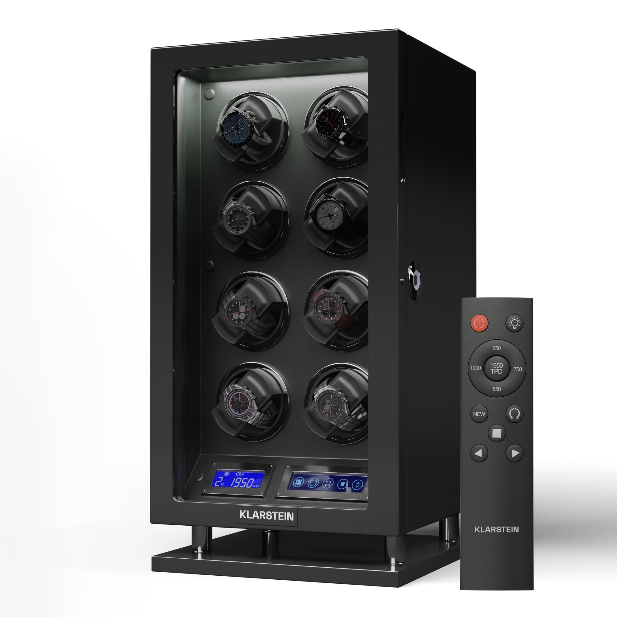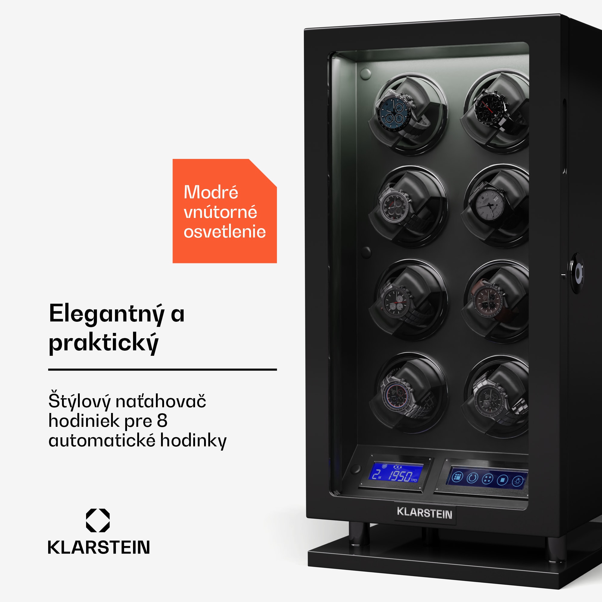 Naťahovač hodiniek a stojan na hodinky Klarstein Verdon 8 kombinuje bezpečné uloženie so štýlovým dizajnom a inovatívnou technológiou. Skriňa z robustnej MDF v kombinácii s elegantným vnútorným vybavením vytvára vkusnú kompozíciu luxusu a elegancie. Vysokolesklý klavírny povrch dodáva naťahovaču Verdon nielen nádherný lesk, ale zároveň z neho robí estetický stredobod každej miestnosti.Medzi špičkové funkcie patria uzamykateľné dvierka s akrylovým okienkom, integrované LED osvetlenie pre umeleckú prezentáciu hodín, tichý chod motora s hlučnosťou menej ako 5 dB a LCD dotykový displej s diaľkovým ovládaním pre maximálne jednoduché používanie. Naťahovač hodiniek ponúka priestor až pre 8 hodiniek a má flexibilné vankúše na hodinky rôznych veľkostí. Naťahovač hodiniek Klarstein Verdon 8 sa zameriava nielen na bezpečné uloženie, ale aj na štýlový vzhľad vašej zbierky. Zámok, ktorý sa otvára len pomocou odtlačku prsta, poskytuje dodatočnú ochranu.