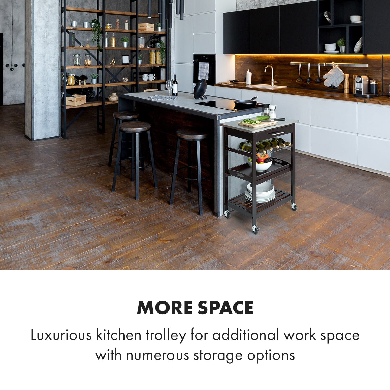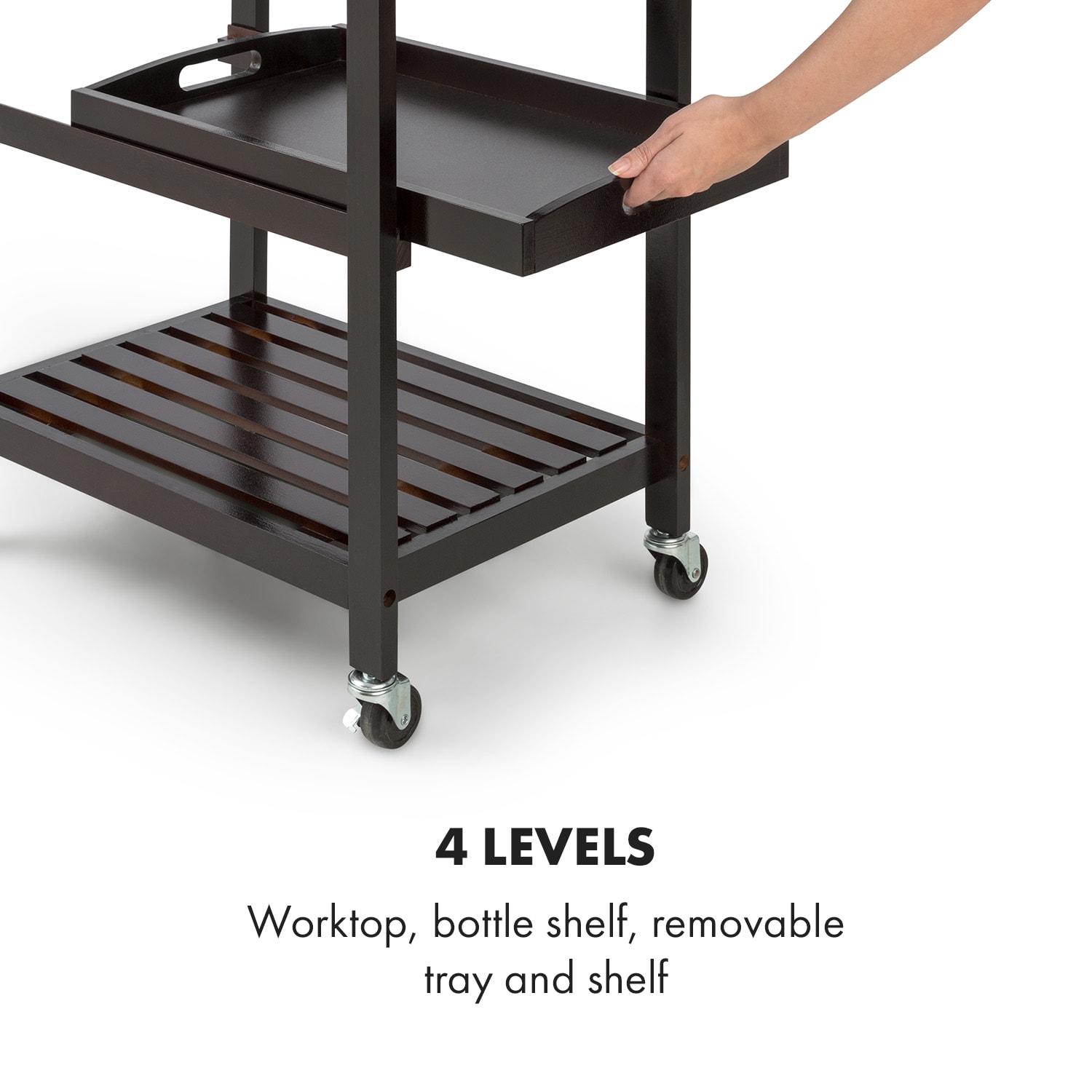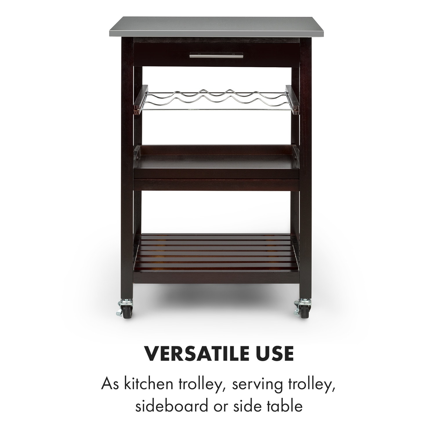 Luxusný odkladací priestor do kuchyne, jedálenských priestorov či obývačiek. Klarstein Vermont kuchynský vozík je vždy tam, kde je potrebný dodatočný priestor a prezentuje sa ako pastva pre oči medzi kuchynskými sluhami. Zhotovený kompletne z dreva, stavia Vermont kuchynský vozíček nie len na vzhľad, ale aj na trvácnosť. Priestor pre všetko: na štyroch poschodiach kuchynského vozíka Klarstein Vermont sú usporiadane umiestnené príbory, zásoby, fľaše a iné kuchynské potreby. O to sa postará mriežka, priestor na podnos, mriežka na fľaše a vrchná zásuvka. Ako obzvlášť praktický sa ukázal vyberateľný servírovací podnos. Poriadok a odkladací priestor tvoria jednu polovicu a pracovná plocha druhú. Na prípravu jedál máte k dispozícii 2400 cm² pracovnej plochy z ušľachtilej ocele. So svojimi pevnými gumenými kolieskami sa servírovací vozík ľahko kĺže dokonca aj po koberci. Tak si vykonáva kuchynský sluha radostne svoju prácu ako servírovací stôl alebo odkladací stolík. Ušľachtilý a vysokokvalitný: Klarstein Vermont kuchynský vozík je luxusný pomocník v kuchyni vyrobený z tmavohnedého lazúrovaného dreva s vrchnou časťou z ušľachtilej ocele.