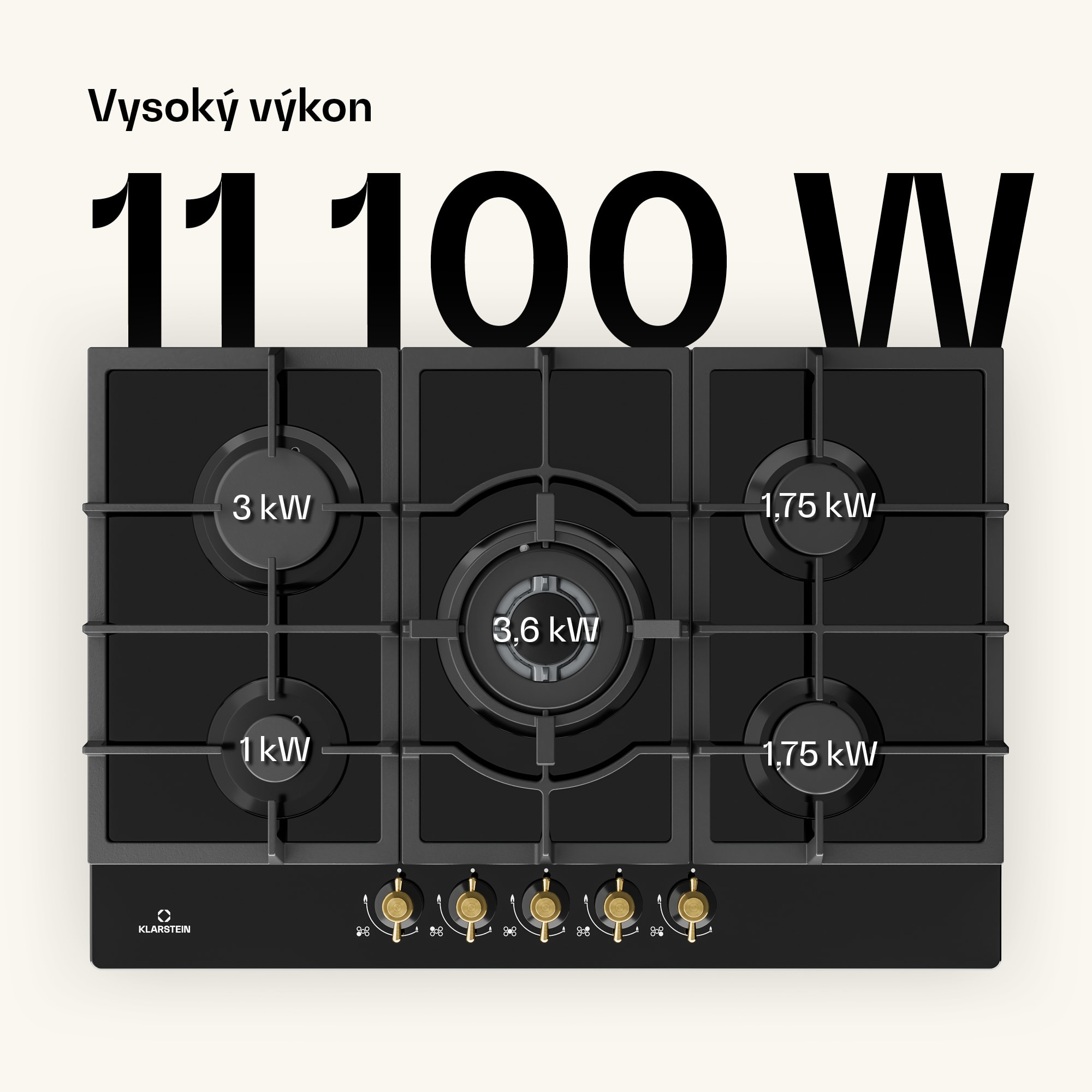 Na priestorovo úspornej varnej doske Victoria 5 od Klarstein sa nachádza päť vysokokvalitných horákov Sabaf, ktoré vaše hrnce i panvice poriadne zohrejú s výkonom 3,6 kW, 3,0 kW a 1 kW ako aj dvakrát po 1,75 kW. Vďaka rôznym veľkostiam horákov je varná doska Victoria 5 vhodná na prípravu všetkých možných jedál – horáky rovnomerne rozvádzajú teplo v strede a po okrajoch kuchynského riadu, takže všetko pripravíte dokonale. Ovládanie je absolútne intuitívne vďaka zrozumiteľným symbolom na veľkých retro dizajnových gombíkoch a prívod tepla môžete nastaviť priamo počas varenia. Plameň zapaľujete prostredníctvom SnapJetIgnition, takže nie je potrebný žiadny ďalší zdroj ohňa. Tri odnímateľné rošty z masívnej liatiny perfektne držia hrnce či panvice nad plameňmi aby sa neprevrátili. Varná doska má tvrdený, sklokeramický povrch, ktorý nielen dobre vyzerá a ľahko sa udržuje, ale zároveň sa aj mimoriadne ľahko čistí.