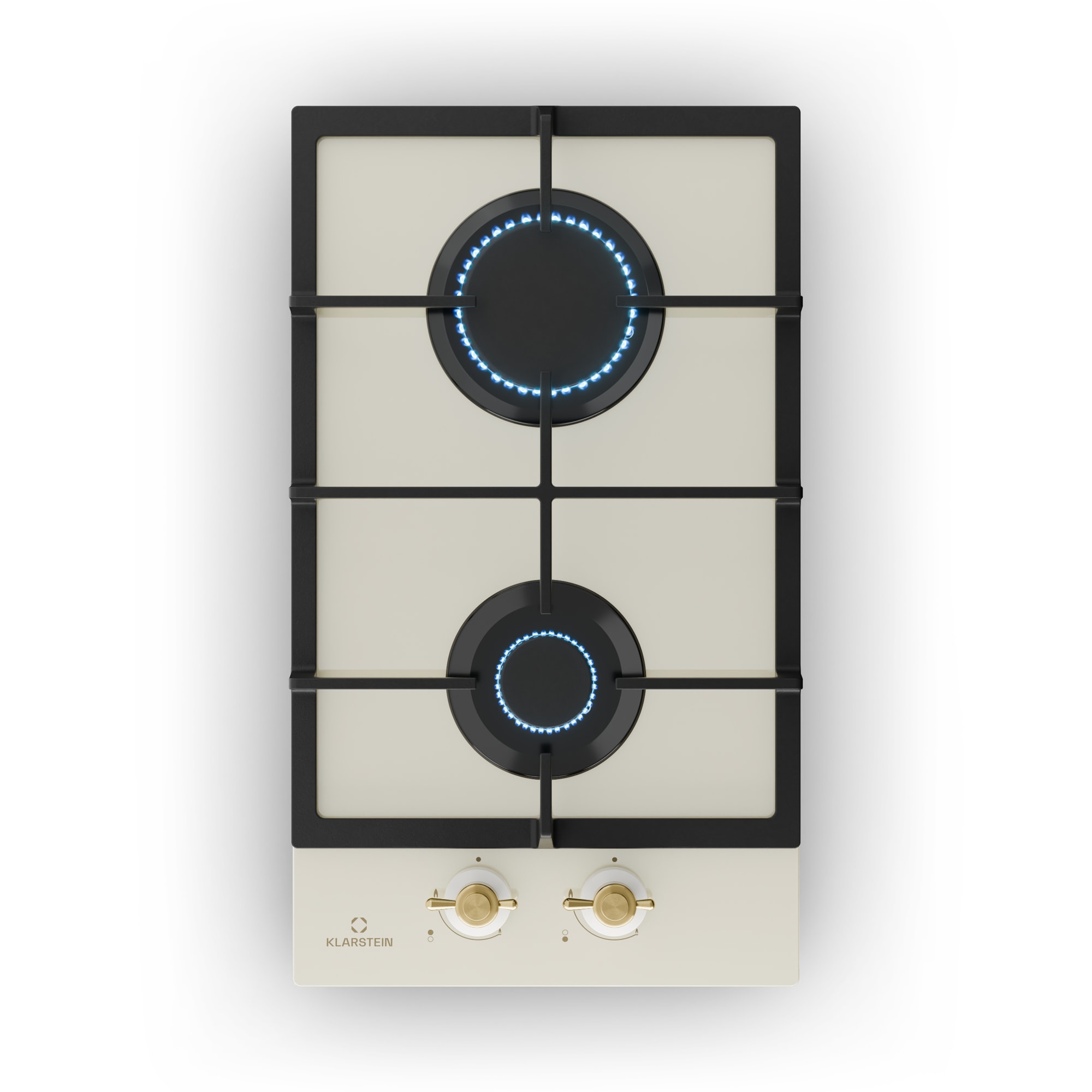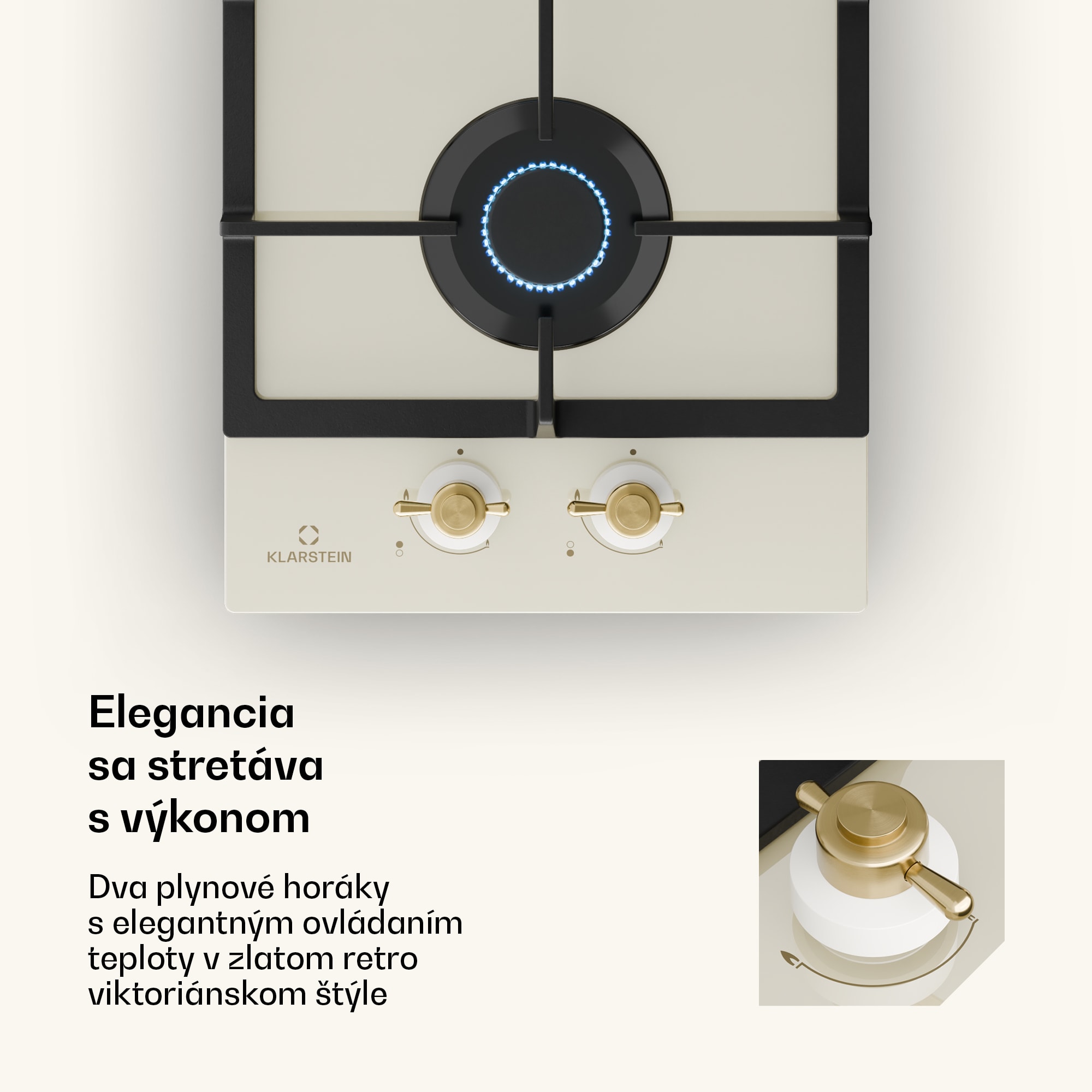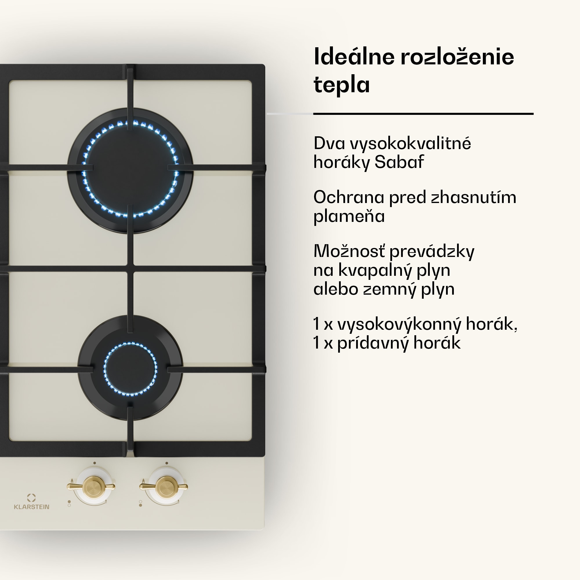 Na priestorovo úspornej varnej doske Victoria Domino od Klarstein sa nachádzajú dva vysokokvalitné horáky Sabaf, ktoré poriadne zohrejú hrnce i panvice s celkovým výkonom 3 kW a 1 kW. Horáky rovnomerne rozvádzajú teplo v strede a po okrajoch riadu, takže sa všetko dokonale uvarí. Ovládanie je absolútne intuitívne vďaka zrozumiteľným symbolom na veľkých retro dizajnových gombíkoch a prívod tepla môžete nastaviť priamo počas varenia. Plameň zapaľujete prostredníctvom SnapJetIgnition, takže nie je potrebný žiadny ďalší zdroj ohňa. Odnímateľný rošt z masívnej liatiny je nad plameňmi dobre uchytený a odolný proti prevráteniu. Varná doska má tvrdený, sklokeramický povrch, ktorý nielen dobre vyzerá a ľahko sa udržuje, ale sa aj mimoriadne ľahko čistí.