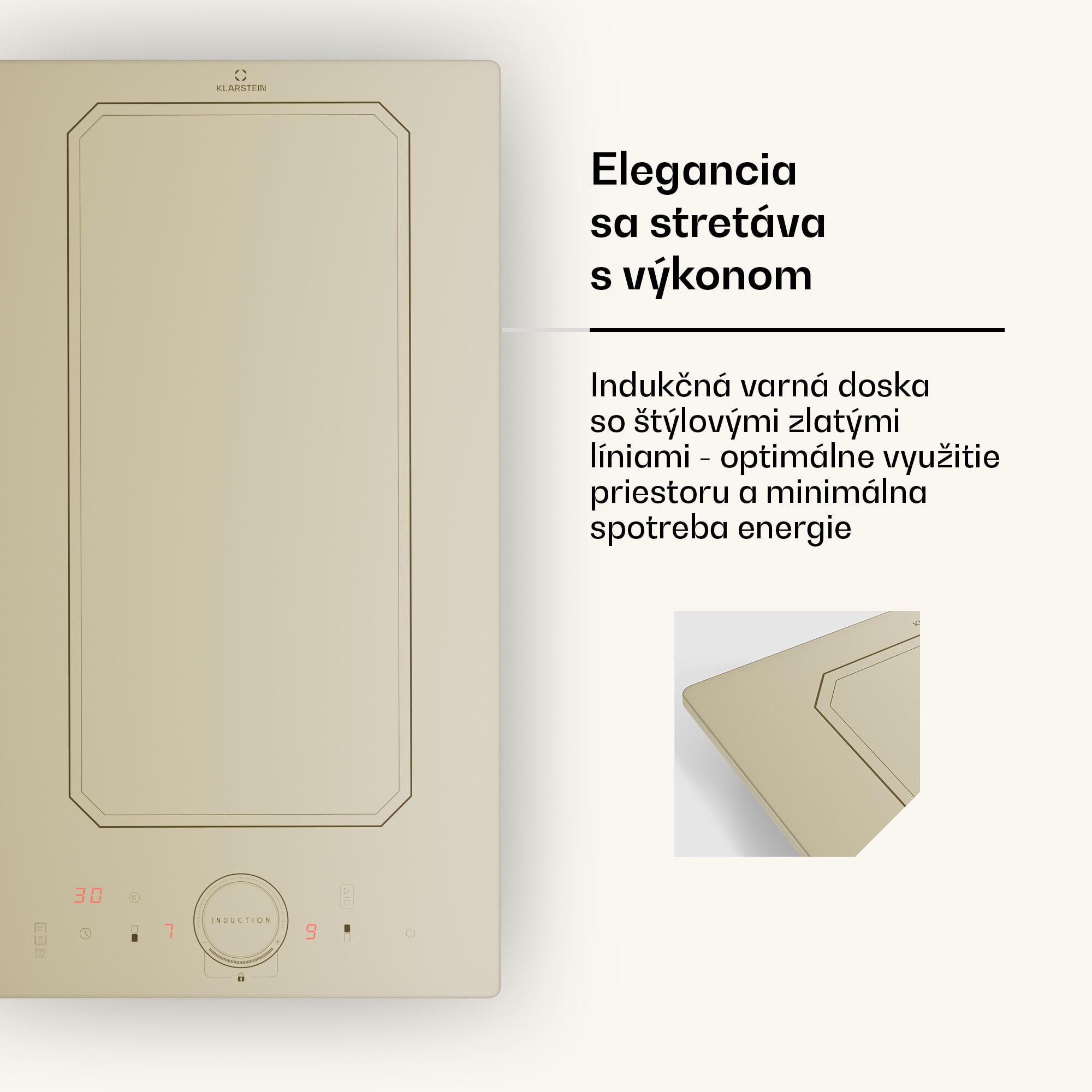 Pre flexibilnejšie varenie: Indukčná varná doska Victoria Domino od Klarstein umožňuje optimálne využitie priestoru s minimálnou spotrebou energie počas varenia. Dve varné plochy s celkovým výkonom 3500 W privedú obsah vašich hrncov či panvíc do varu v rekordne krátkom čase a prostredníctvom VarioHeating ich možno spojiť do jednej flexi zóny. Výkon oboch jednotlivých zón je možné regulovať samostatne a majú funkciu ThermoBoost, ktorá poskytuje zvýšený výkon pre rýchly ohrev. Sklokeramická varná doska Victoria sa jednoducho obsluhuje pomocou integrovaného senzorového dotykového ovládacieho panela a digitálneho displeja. To znamená, že ani gombíky, ani ovládacie prvky nebudú prenikať cez povrch kuchynskej linky. Indukčná varná doska Victoria od Klarstein vizuálne presvedčí svojím ľahko udržiavateľným a elegantným sklokeramickým povrchom: varná doska sa bez problémov hodí do každej kuchynskej linky – či už klasickej alebo modernej.