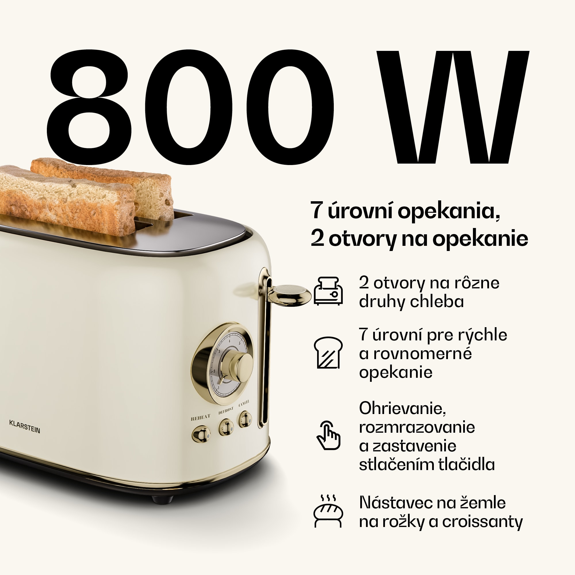 Základná raňajková súprava Klarstein Victoria zaujme kvalitným retro vzhľadom, lesklými prvkami a jemnými zlatými detailmi, a preto sa bez problémov hodí do nadčasovo navrhnutých kuchýň. Táto raňajková súprava, ktorá je súčasťou dizajnovej série Victoria, stelesňuje eleganciu a sofistikovaný vintage štýl, vďaka čomu je prirodzeným doplnkom každej dobre vybavenej kuchyne. Základnú súpravu tvorí 2-štrbinový hriankovač s výkonom 800 W a rýchlovarná kanvica s objemom 1,7 litra. Hriankovač disponuje aj 7 rôznymi stupňami opečenia a má nástavec na pečenie žemlí a croissantov. Kanvica s výkonom až 2200 W je vybavená integrovaným filtrom vodného kameňa. Chceli by ste si zariadiť celú kuchyňu s eleganciou inšpirovanou viktoriánskym štýlom? Objavte všetky naše spotrebiče Victoria a vytvorte si nadčasovú, harmonickú kuchyňu!