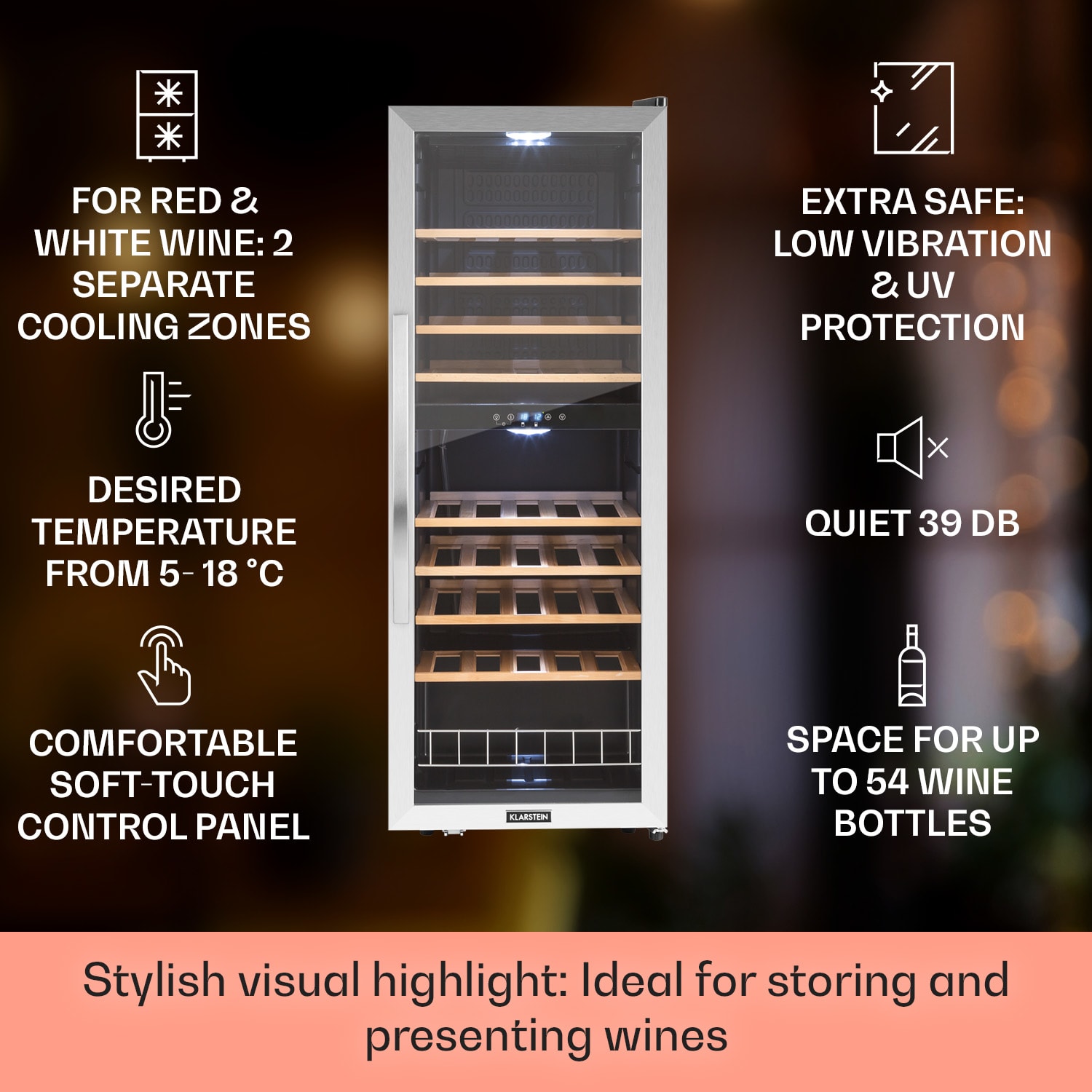 Pre ten najlepší pôžitok z vína: Vinotéka Klarstein Vinamour 48 Uno zaujme reguláciou teploty až na stupeň presne, 3 policovými zásuvkami a prehľadným dotykovým ovládacím panelom. Predné dvere z dvojstenného skla zabezpečujú dômyselnú prezentáciu kvalitných vín. Prepínateľné vnútorné osvetlenie šikovne dotvára scénu pre uložené fľaše. Klarstein Vinamour 48 Uno chladnička na víno je preto štýlovou ozdobou nielen každej domácnosti, ale aj barov a reštaurácií. Táto dvojzónová vinotéka umožňuje uchovávať rôzne druhy vín pri ideálnych teplotách.Chladnička na víno Vinamour 48 Uno od spoločnosti Klarstein ponúka štýlový a moderný úložný priestor na dokonale vychladené vína.