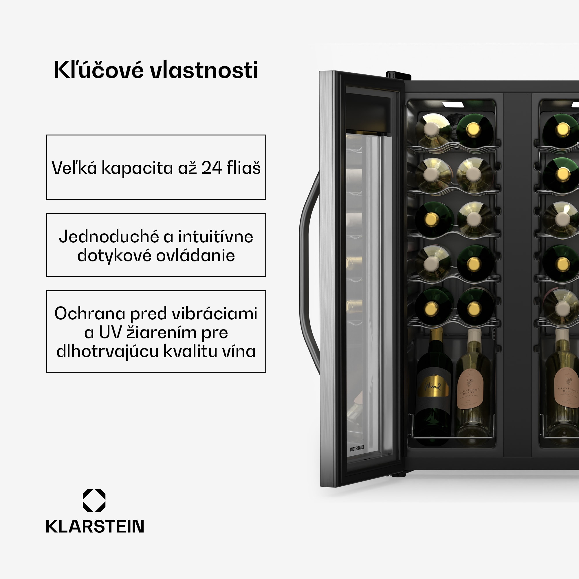 Vinotéka Klarstein Vinamour sdvojitými dverami z nehrdzavejúcej ocele ponúka milovníkom vína štýlové a funkčné riešenie na optimálne uskladnenie a prezentáciu ich zbierky vín. Vďaka oddeleným chladiacim zónam pre červené a biele vína sa každá fľaša udržiava pri ideálnej teplote od 5 do 18 °C.Robustné kovové police s plastovým povrchom ponúkajú bezpečný úložný priestor až pre 24 fliaš, zatiaľ čo vnútorné LED osvetlenie elegantne prezentuje vašu zbierku. Vďaka intuitívnemu dotykovému ovládaniu možno teplotu dvojdverovej chladničky na víno Klarstein Vinamour nastaviť bez námahy. Táto vinotéka je voľne stojaca a možno ju flexibilne umiestniť do akéhokoľvek prostredia, takže je ideálna pre meniace sa životné situácie. Vibrácie a UV žiarenie sú minimalizované, aby sa dlhodobo zachovala kvalita vášho vína.Aby sa maximalizovala životnosť a výkon chladničky na víno Vinamour, mala by sa pravidelne čistiť a inštalovať v dobre vetranej miestnosti. Vyhnite sa priamemu slnečnému žiareniu a silným vibráciám.Vychutnajte si svoje vína vždy pri ideálnej teplote – objednajte si teraz dvojzónovú chladničku na víno Klarstein Vinamour Double Door!