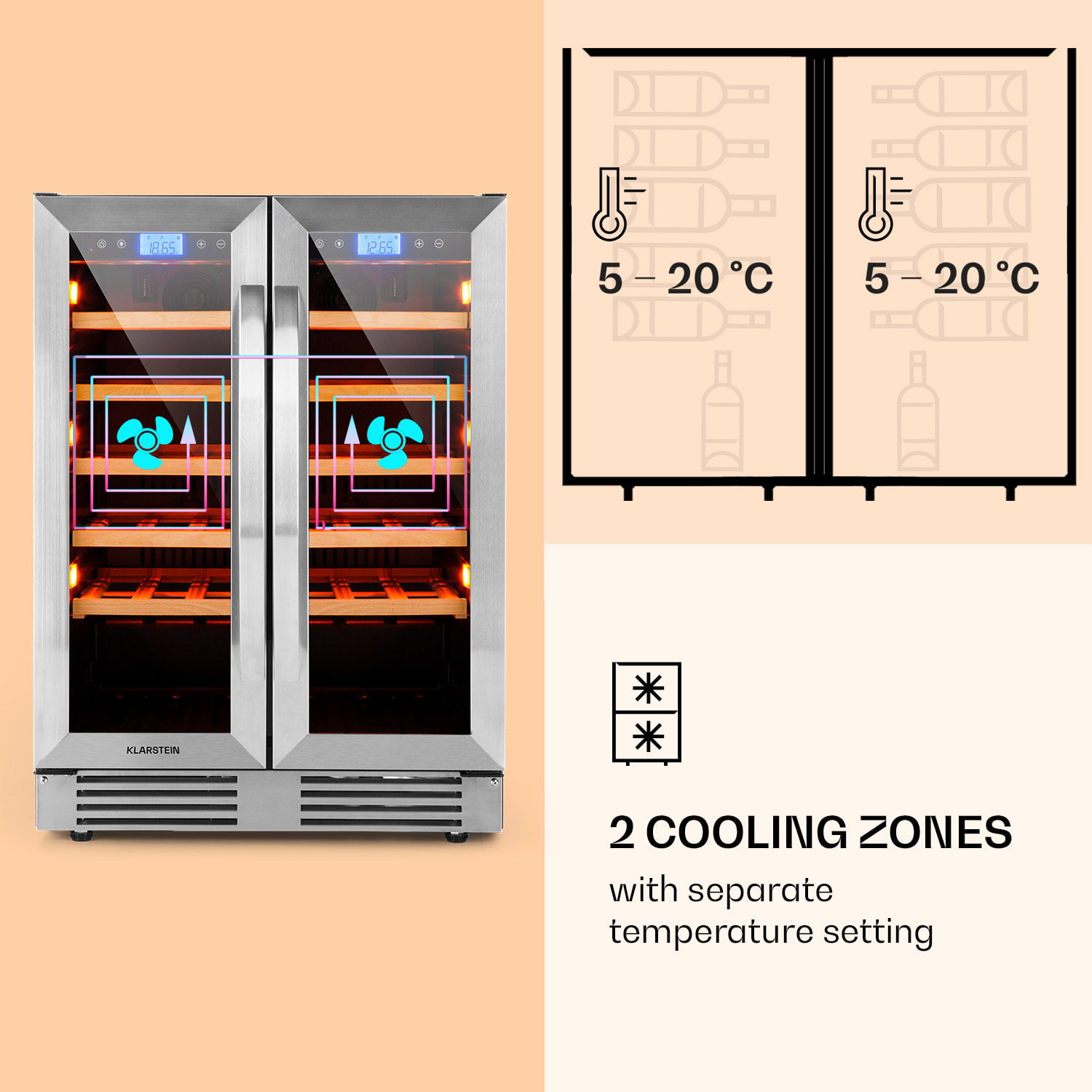 Dvojzónová vinotéka je štýlovou pastvou pre oči na akomkoľvek mieste. Presvedčí aj svojou prepracovanou funkčnosťou: vďaka dvom chladiacim zónam s rôznymi nastaveniami teploty môžete chladiť a skladovať červené i biele vína súčasne. Ušľachtilé vína totiž rozvinú svoju plnú arómu až pri správnej teplote chladenia. O dokonalý pôžitok z vína sa starajú aj predchladené poháre. Prvotriedne skladovanie vína pre reštauratérov a znalcov: Veľkokapacitná dvojzónová chladnička na víno Vinovilla Grande 116 Built-in Duo od Klarstein je štýlový úložný priestor s najlepšími podmienkami pre všetky druhy vín. Táto Dvojzónová vinotéka je ideálnym riešením pre každého milovníka vína.