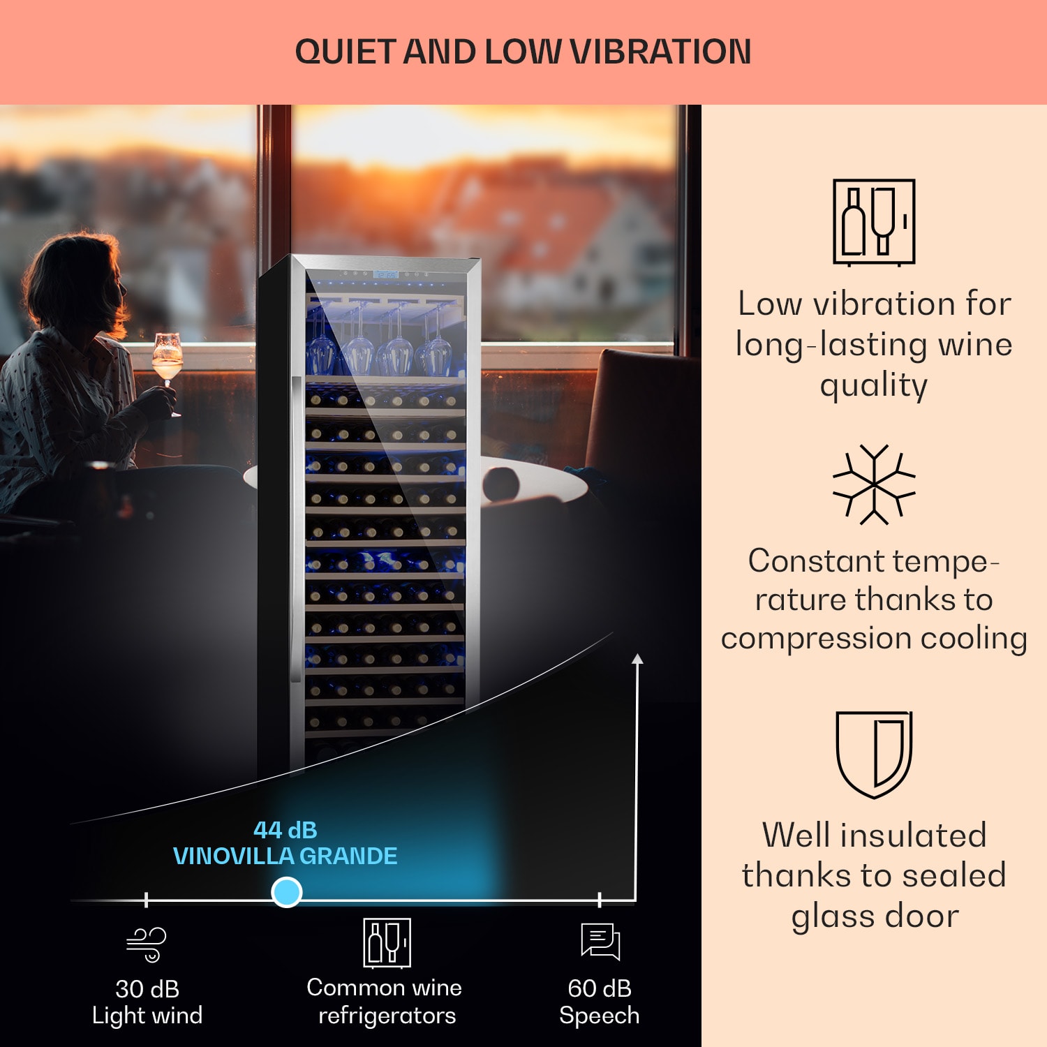 Osvetlená vinotéka Klarstein Vinovilla Grande 165 Built-in Uno ponúka priestor pre 165 fliaš vína na 13 policiach z bukového dreva. Delikátne vína odpočívajú pri správnej skladovacej teplote, ktorú môžete pohodlne zvoliť pomocou dotykového displeja. Vychutnajte si dokonale vychladený pôžitok, pretože na držiaku na poháre môžete súčasne nastaviť rovnakú teplotu až pre 24 pohárov na víno. Prvotriedne skladovanie a prezentácia vína: veľkokapacitná chladnička na víno Vinovilla Grande 165 Built-in Uno od Klarstein ponúka štýlový úložný priestor pri ideálnej teplote na pitie! Táto vstavaná vinotéka je ideálnym riešením pre každého milovníka vína.