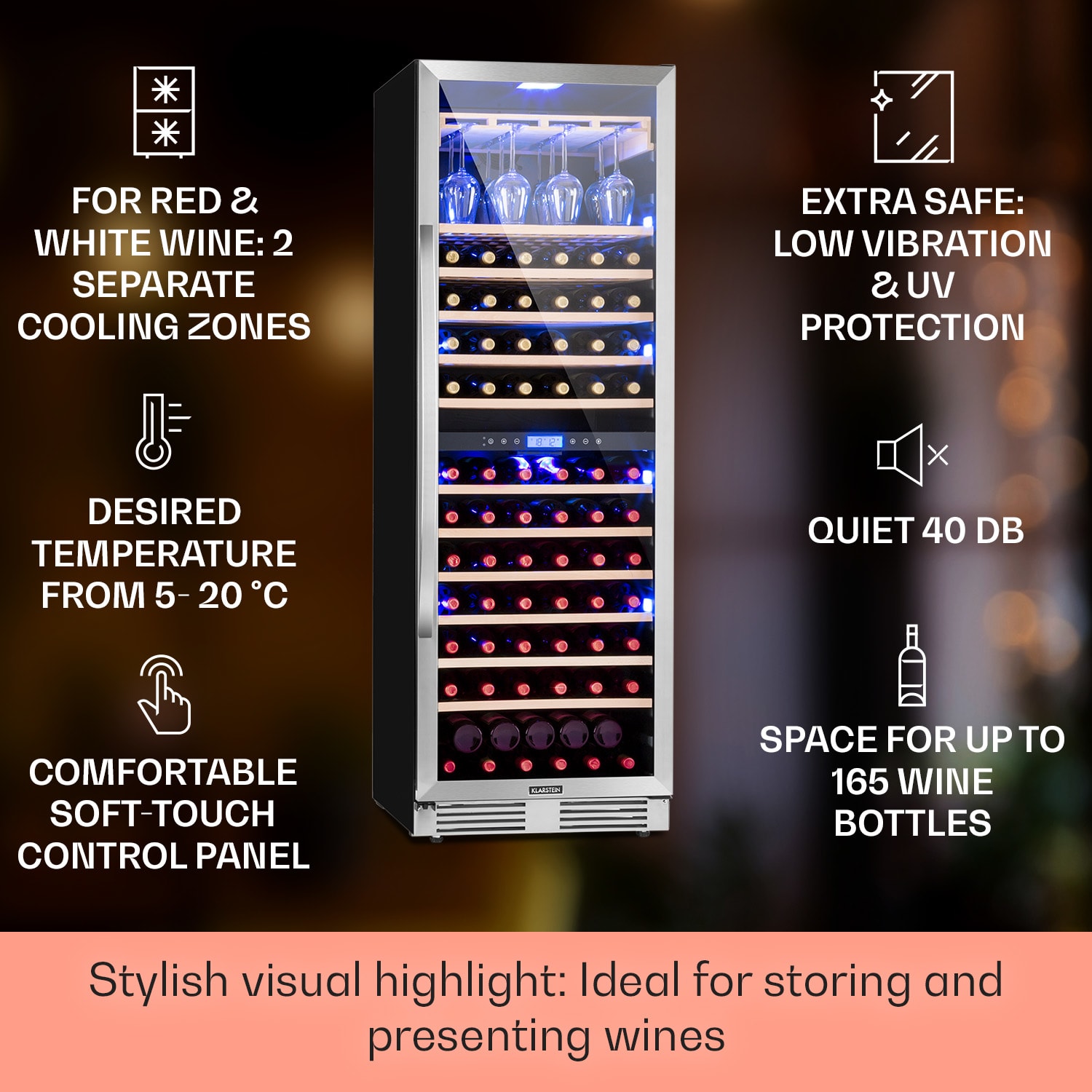 Dvojzónová vinotéka je štýlovou pastvou pre oči na akomkoľvek mieste. Presvedčí aj svojou prepracovanou funkčnosťou: vďaka dvom chladiacim zónam s rôznymi nastaveniami teploty môžete chladiť a skladovať červené i biele vína súčasne. Ušľachtilé vína totiž rozvinú svoju plnú arómu až pri správnej teplote chladenia. O dokonalý pôžitok z vína sa starajú aj predchladené poháre. Prvotriedne skladovanie vína pre reštauratérov a znalcov: Veľkokapacitná dvojzónová chladnička na víno Vinovilla Grande 116 Built-in Duo od Klarstein je štýlový úložný priestor s najlepšími podmienkami pre všetky druhy vín. Táto Dvojzónová vinotéka je ideálna pre každého, kto si chce vychutnať víno v jeho najlepšej podobe.