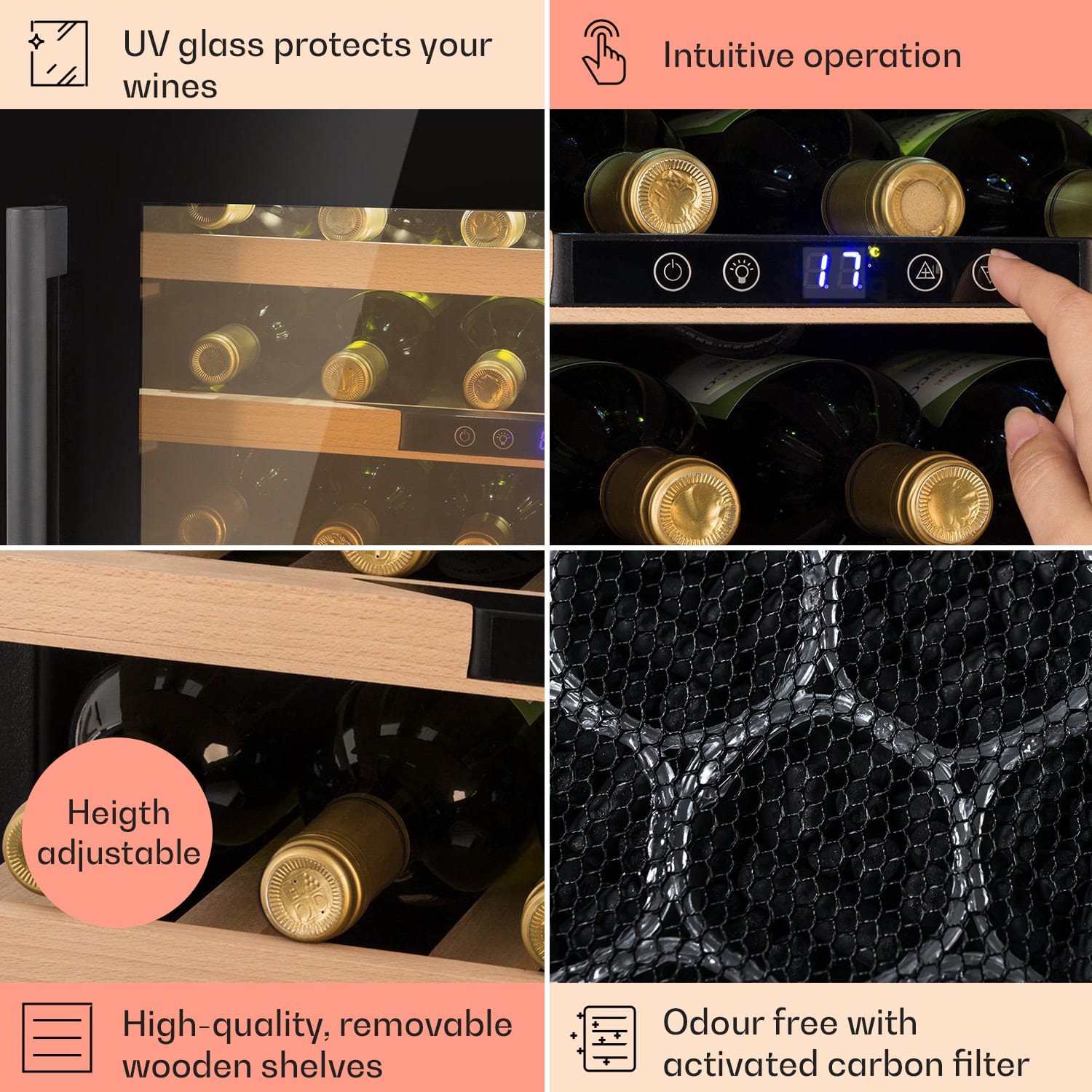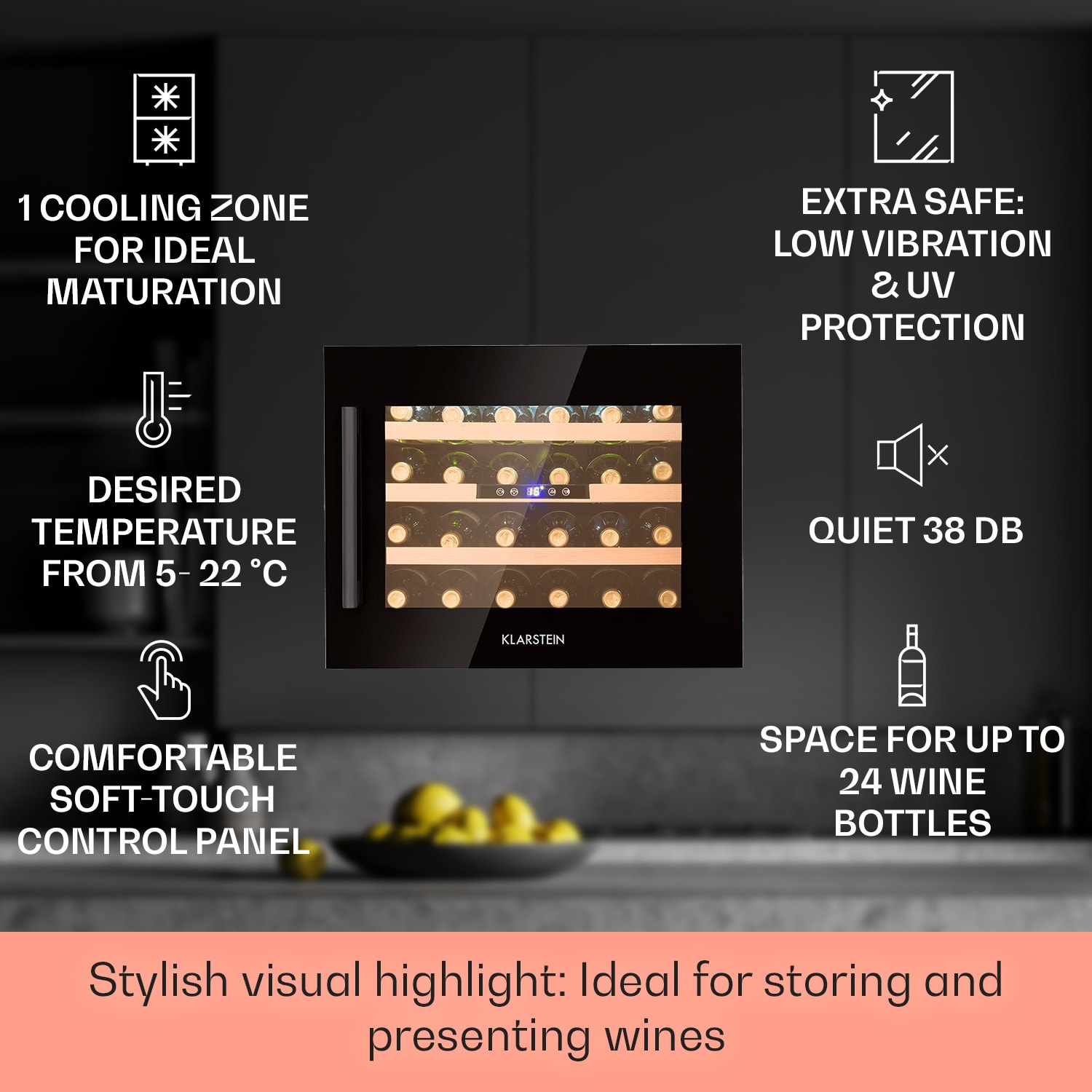 Vinotéka Vinsider 24 Onyx Edition od spoločnosti Klarstein garantuje optimálne uskladnenie Vášho vína pre najlepší pôžitok z jeho pitia. Vďaka vinotéke Klarstein Vinsider 24 Onyx Edition môžete poskytnúť vínu ideálne podmienky, ktoré potrebuje, aby malo optimálnu teplotu na konzumáciu a aby bola zachovaná plná aróma. Jediné, čo musíte urobiť, je otvoriť elegantné predné dvere s rámom OnyxCrystal s tónovaným panoramatickým oknom a umiestniť víno do jednej zo 3 drevených políc. Potom nastavte požadovanú teplotu chladenia a Vaša vinotéka od spoločnosti Klarstein sa postará o vhodné prostredie pre Vaše víno. Keď si ho budete chcieť Vy a Vaši hostia vychutnať, bude mať správnu teplotu: kedykoľvek a vo Vašej priamej blízkosti. Vďaka teplotnému regulátoru je možné vo vinotéke vytvoriť teploty medzi 5 a 22 °C. Tak bude ideálne postarané o biele aj červené víno – či už čoskoro v čase večere, alebo počas ďalších mesiacov Vaše víno bude počas uskladnenia ochránené pred vibráciami alebo dopadom svetla. Táto vinotéka umožňuje uchovávať rôzne druhy vína pri ich ideálnych teplotách. Vinotéka Vinsider 24 Onyx Edition od spoločnosti Klarstein nanovo interpretuje klasickú vínu pivnicu: v pôsobivom elegantnom dizajne z ocele, skla a dreva. Vďaka prepínateľnému LED osvetleniu interiéru bude Vaše víno v každom čase decentne viditeľné. Pri každej ceste do kuchyne sa teda môžete potešiť pri pohľade na Vašu zbierku vín. Niet divu, ak budú Vaši hostia závistlivo hľadieť na Vašu zbierku vín, pretože takúto vinotéku by mal rád každý! S vinotékou Klarstein Vinsider 24 Onyx Edition bude pôžitok z vína je ešte lepší!Tvar fliaš na víno ovplyvňuje maximálny objem a kapacitu vinotéky.