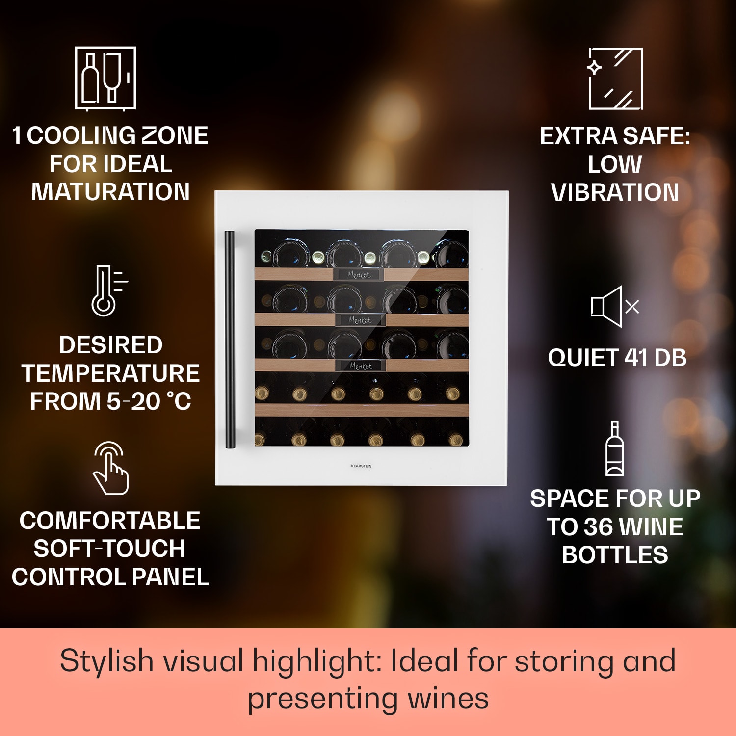 Vďaka vstavanej vinotéke Vinsider 36 Built-In Uno od Klarstein môžete zabezpečiť vínu ideálne podmienky na to, aby plne rozvinulo svoju chuť a vôňu. Všetko čo musíte spraviť je otvoriť elegantné predné dvierka s panoramatickým sklom a položiť víno na jednu zo 4 drevených políc. Potom stačí nastaviť želanú teplotu a vaša vinotéka od Klarstein sa postará o „príjemnú atmosféru pre víno“. Ak budete vašim hosťom chcieť ponúknuť víno, tak bude vždy vychladené na tú správnu teplotu: vždy a po ruke. Vstavaná vinotéka je skutočne neoceniteľným doplnkom pre každého milovníka vína.