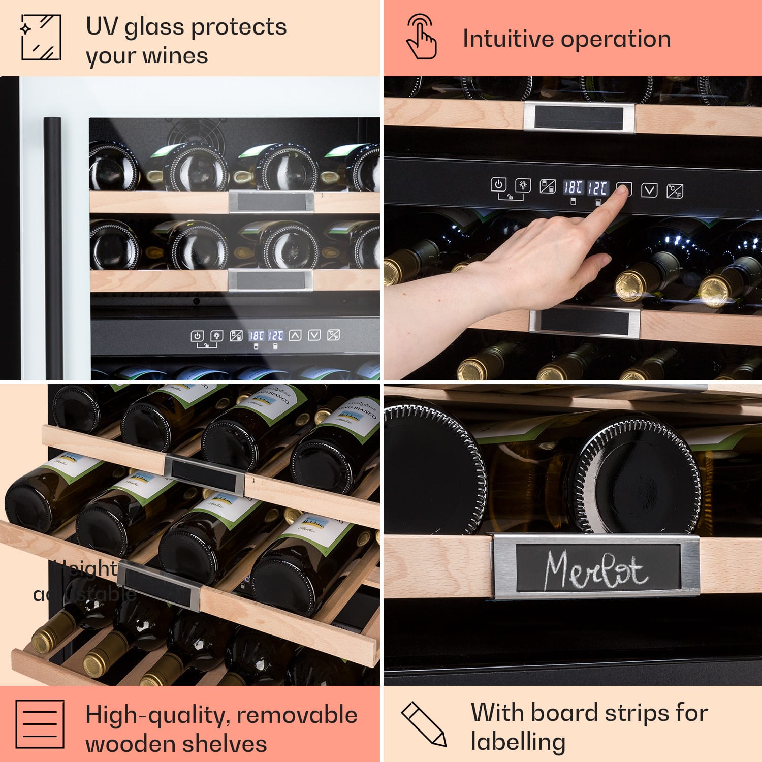 Vinotéka Vinsider 36 Quartz Edition od Klarstein: Optimálne uskladnenie vína vám zaručí ten najlepší pôžitok z pitia! Pomocou ušľachtilej 2-zónovej jednotky na reguláciu teploty vína môžete 36 fliaš toho najlepšieho vína priviesť na ideálnu teplotu požadovanú na pitie, dlhodobo ich skladovať i prezentovať. Sklenené dvere s panoramatickým oknom a popisovateľné policové zásuvky zabezpečujú dobrý prehľad, zatiaľ čo fľaše sú optimálne chránené pred vibráciami a dopadom svetla. Chlaďte červené i biele vína súčasne a optimálne ich skladujte: s luxusnou chladničkou na víno Vinsider 36 Quartz Edition od Klarstein, ktorá funguje aj ako vstavaná vinotéka.