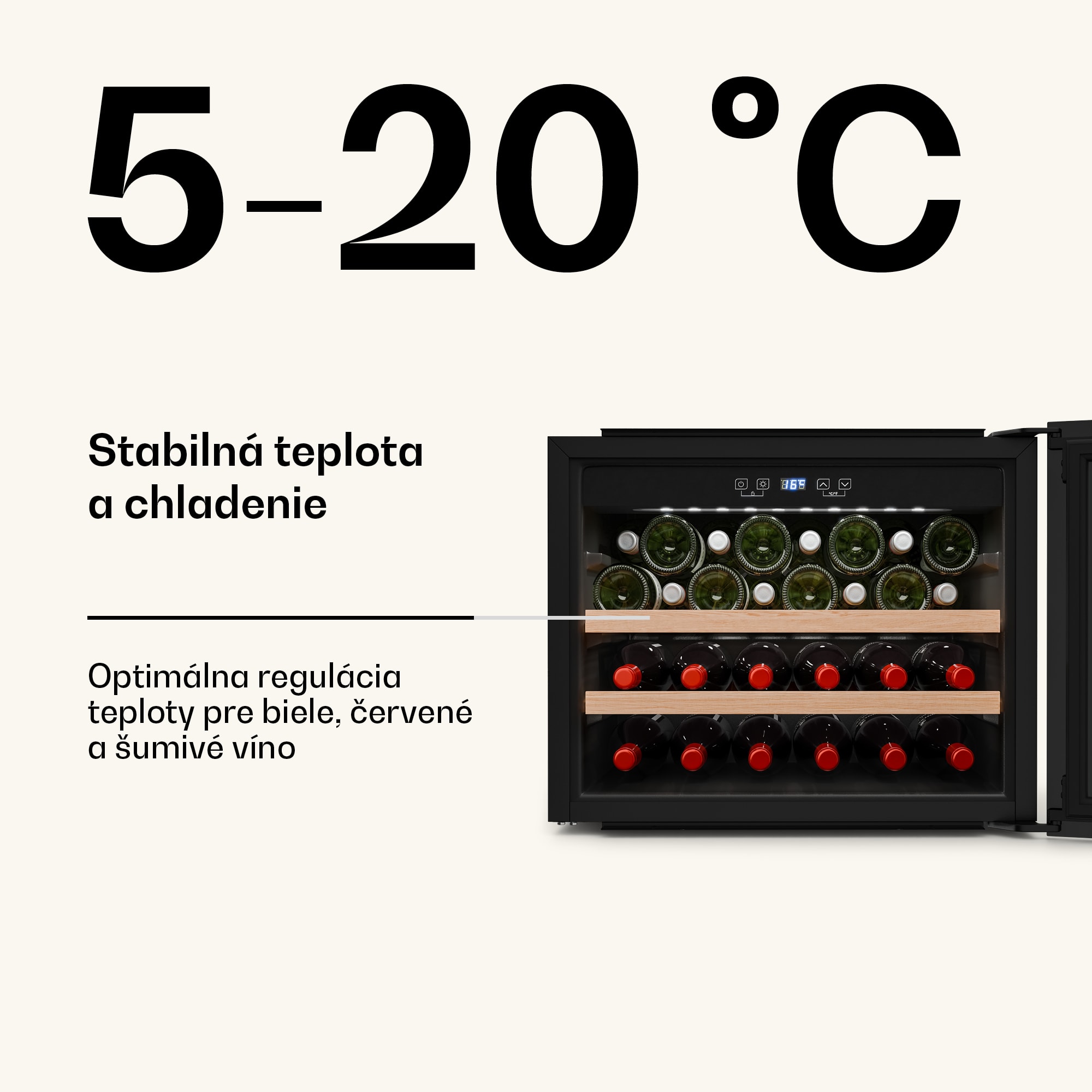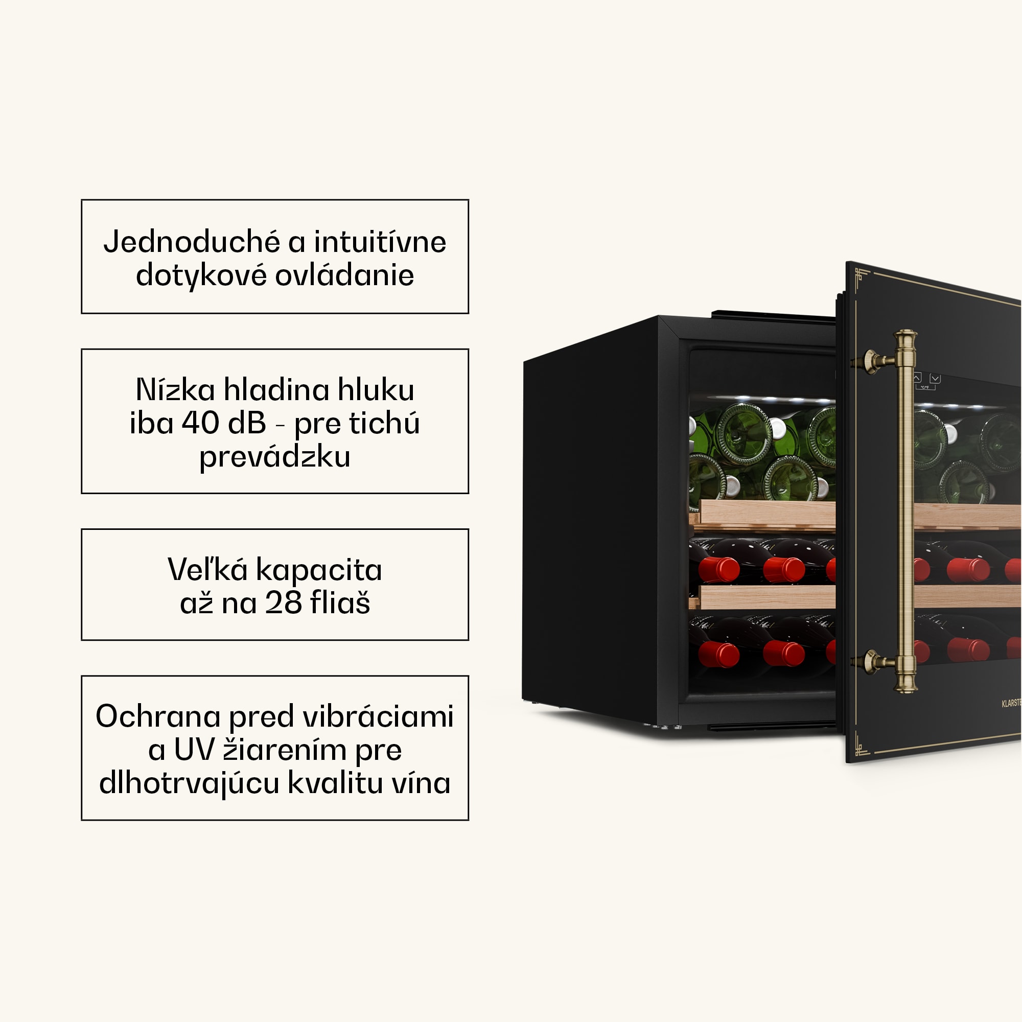 Vinotéka Klarstein Vinsider Victoria 28 kombinuje vintage dizajn s optimálnou funkčnosťou na dokonalé uskladnenie a prezentáciu vašich vín.S kapacitou až 28 fliaš ponúka chladnička na víno Klarstein Vinsider Victoria 28 dostatok priestoru pre vaše najcennejšie vína. Vysokokvalitné spracovanie s odnímateľnými drevenými policami zaručuje nielen štýlovú prezentáciu, ale aj skladovanie bez vibrácií a s ochranou proti UV žiareniu, ktorá dlhodobo zachováva kvalitu vína. Intuitívne dotykové ovládanie umožňuje jednoduchú reguláciu teploty v rozsahu od 5 do 20 stupňov Celzia, takže vaše vína budú mať vždy ideálnu teplotu na pitie. Vďaka tichej prevádzke s hlučnosťou len 40 dB a elegantnému vnútornému LED osvetleniu chladnička na víno dokonale zapadne do každej kuchyne a vytvorí príjemnú atmosféru.Chladničku na víno je potrebné pravidelne čistiť a podľa potreby upravovať teplotu, aby sa zabezpečilo optimálne skladovanie vašich vín. Táto vstavaná vinotéka je ideálnym riešením pre každého milovníka vína.Vyskúšajte rozdiel a kúpte si chladničku na víno Klarstein Vinsider Victoria 28 pre dokonalé uskladnenie vína.