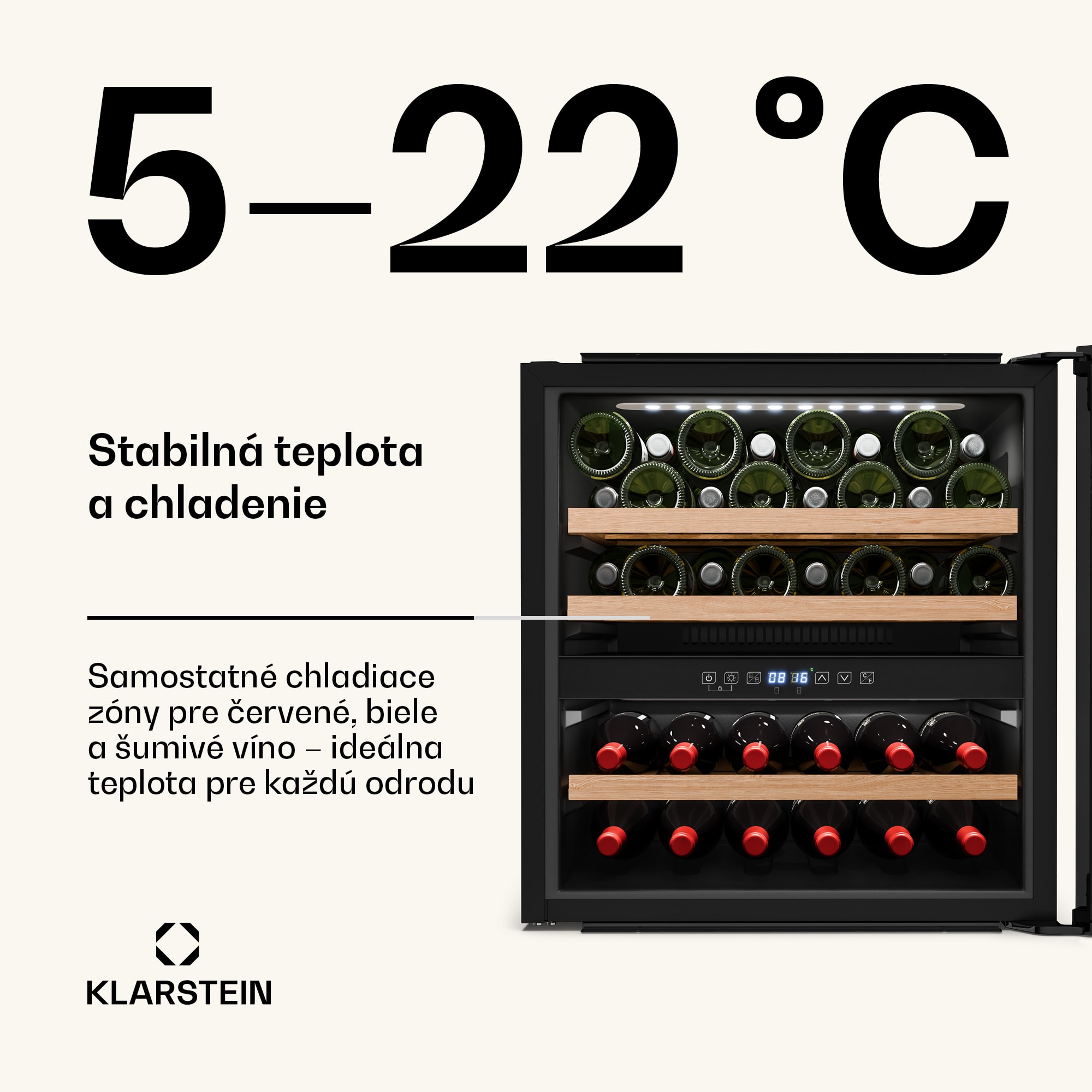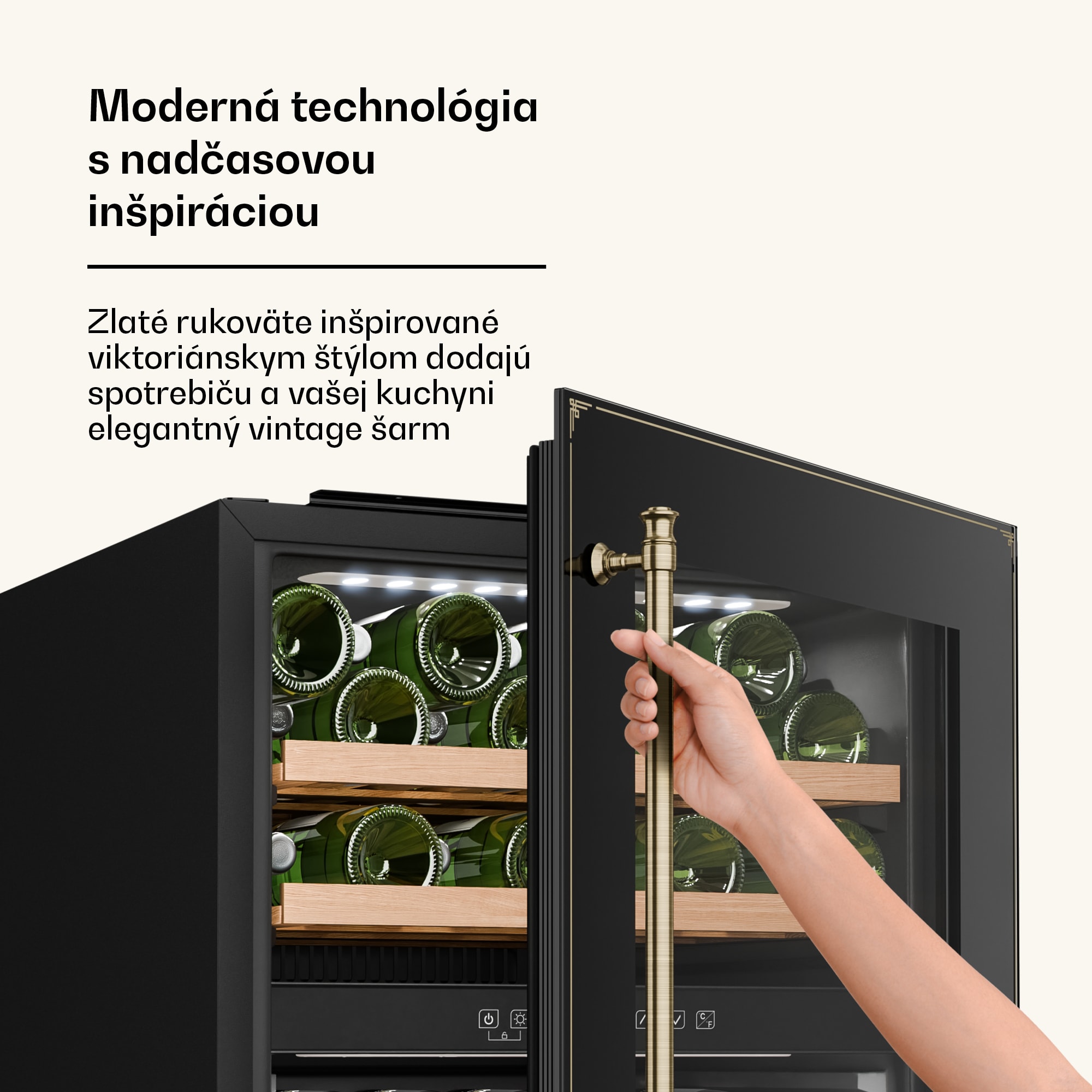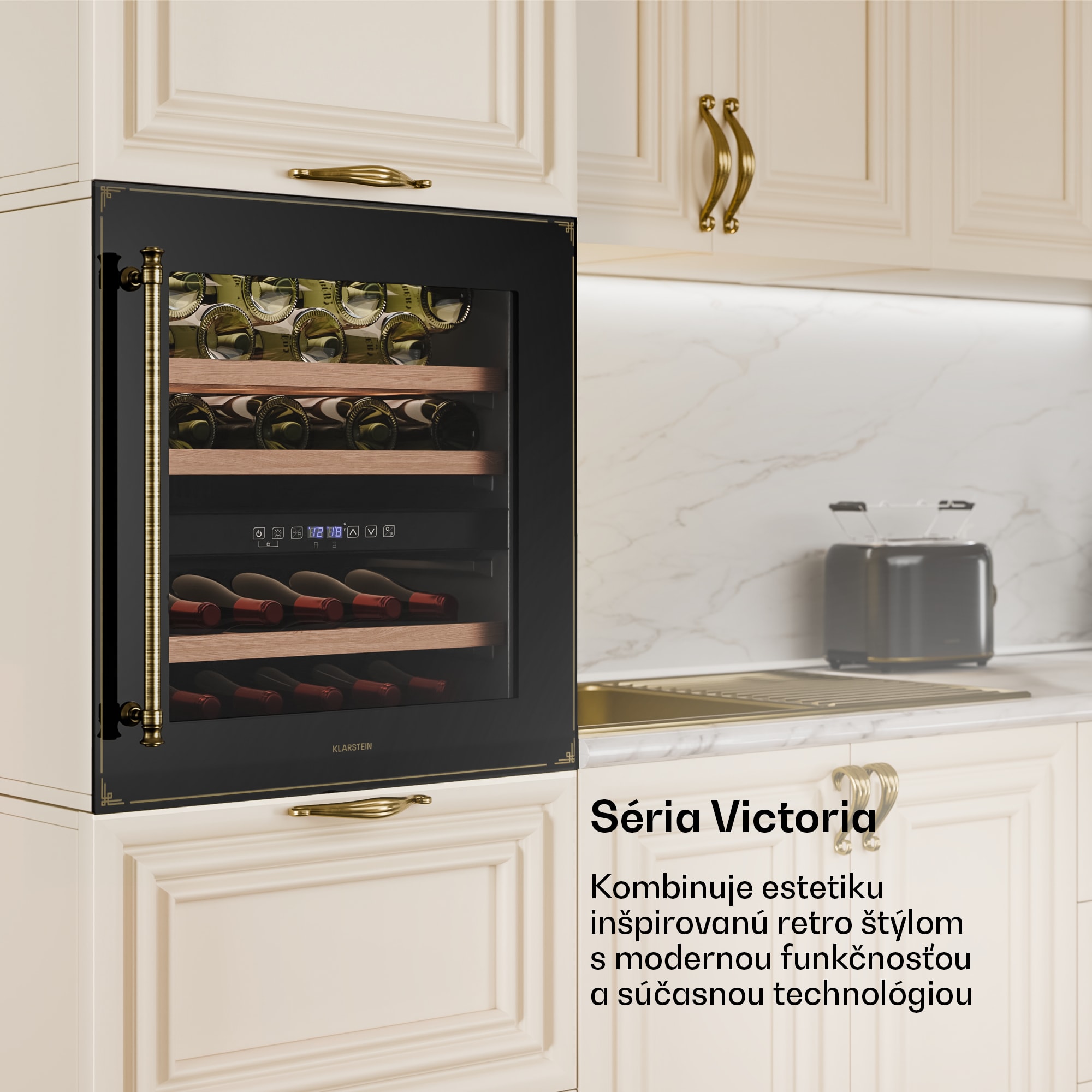 Vinotéka Klarstein  Vinsider Victoria 36 kombinuje vintage dizajn s optimálnou funkčnosťou na dokonalé uskladnenie a prezentáciu vašich vín.S kapacitou až 36 fliaš ponúka  chladnička na víno   Klarstein  Vinsider Victoria 36 dostatok priestoru pre vaše najcennejšie vína. Vysokokvalitné spracovanie s odnímateľnými drevenými policami v dvoch chladiacich zónach zaručuje nielen štýlovú prezentáciu, ale aj skladovanie bez vibrácií a s ochranou proti UV žiareniu, ktorá dlhodobo zachováva kvalitu vína. Intuitívne dotykové ovládanie umožňuje jednoduchú reguláciu teploty v rozsahu od 5 do 22 stupňov Celzia, takže vaše vína budú mať vždy ideálnu teplotu na pitie. Vďaka tichej prevádzke s hlučnosťou len 41 dB a elegantnému vnútornému LED osvetleniu chladnička na víno  dokonale zapadne do každej kuchyne a vytvorí príjemnú atmosféru. Chladničku na víno  je potrebné pravidelne čistiť a podľa potreby upravovať teplotu, aby sa zabezpečilo optimálne skladovanie vašich vín. Táto vstavaná vinotéka je ideálnym riešením pre každého milovníka vína.Vyskúšajte rozdiel a kúpte si  chladničku na víno   Klarstein  Vinsider Victoria 36 pre dokonalé uskladnenie vína.