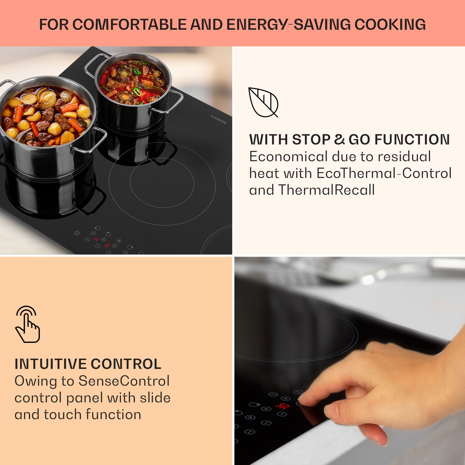 Sklokeramická varná doska Virtuosa 5 od Klarstein spája modernú technológiu s luxusným vzhľadom a prináša do vašej kuchynskej linky nový lesk.Tu môžete variť podľa vlastnej chuti. vstavaná varná doska Virtuosa 5 od Klarstein vám ponúka dve veľké, dve malé a jednu flexibilnú varnú dosku vario na rýchlu prípravu jedál. Celkový výkon 8200 W privedie obsah hrncov a panvíc do varu. Mimoriadne praktickou funkciou je varná doska Vario, ktorá pracuje s výkonom 1000 alebo 2200 W v závislosti od veľkosti hrnca a automaticky rozpozná veľkosť riadu. Sklokeramická rúra Virtuosa 5 od Klarstein sa ovláda pomocou integrovaného dotykového ovládacieho panela, prostredníctvom ktorého môžete nastaviť 9 stupňov výkonu jednotlivých polí a časovač pečeni. Aby všetko pri varení prebiehalo hladko, má vstavaný sporák Klarstein Virtuosa 5 ochranu proti prehriatiu, ukazovateľ zvyškového tepla a detskú poistku, ktorá zabraňuje náhodným zmenám nastavení varenia.Keramická varná doska Victoria 5 od Klarstein vizuálne presvedčí svojím ľahko udržiavateľným a elegantným sklokeramickým povrchom: varná doska sa bez problémov hodí do každej kuchynskej linky – či už klasickej alebo modernej. Materiál potrebný na montáž do pracovnej dosky je zahrnutý priamo v balení.