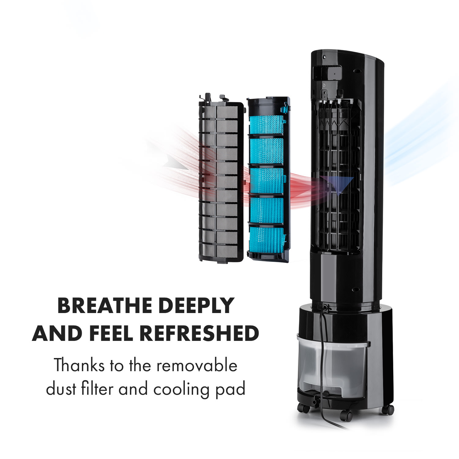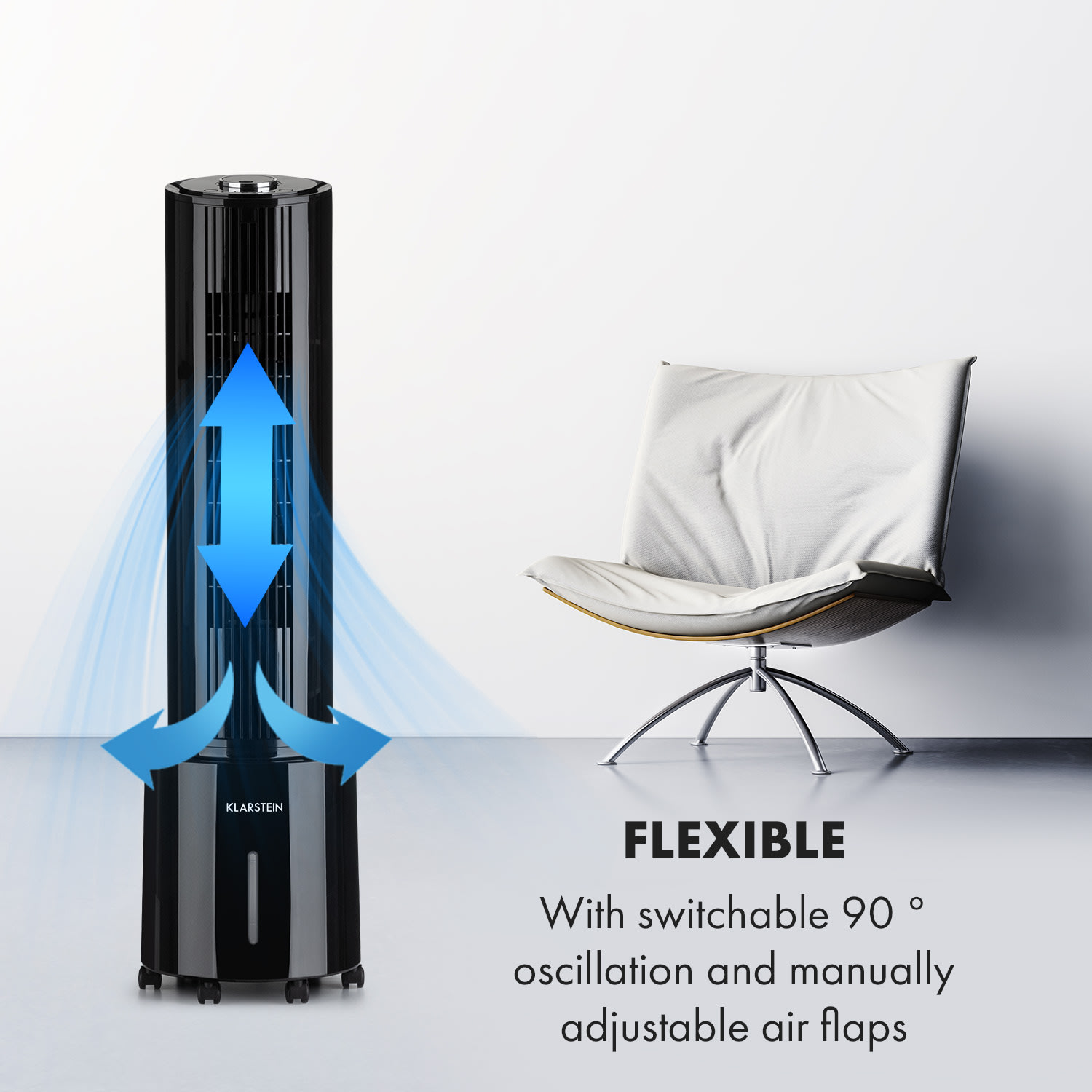 Štvornásobne osviežujúci, štýlový vežový ventilátor. Ochladzovač vzduchu 4 v 1 Klarstein Waterfall ti poskytne svieži vzduch ako ventilátor, ochladzovač vzduchu, čistič vzduchu a zvlhčovač vzduchu.Vďaka vysokému prietoku vzduchu 400 m³/h rozhýbe zariadenie Klarstein Waterfall ako ventilátor letný vzduch a vytvára príjemný vánok v troch rýchlostiach. Okrem toho si môžeš zvoliť prírodný režim, režim spánku alebo normálny režim V kombinácii s funkciou ochladzovača vzduchu je prúd vzduchu navyše príjemne vychladený a poskytuje osvieženie. Voda sa vtedy odparuje z 4-litrovej nádrže cez podložku na zvlhčovanie vzduchu. Tým odvádza teplo z prúdiaceho vzduchu prirodzeným a mimoriadne energeticky úsporným spôsobom – prúd vzduchu sa stáva príjemne chladným vánkom a precízne osviežuje, či už pri stole, na gauči alebo v posteli. V prípade potreby znižujú teplotu pre ešte väčšie ochladenie dva chladiace akumulátory do vodnej nádrže.Vďaka tomu je zariadenie Klarstein Waterfall vítaným pomocníkom nielen v lete: ako zvlhčovač vzduchu skoncuje v zime so suchým vzduchom pri vykurovaní. Ak sa má osviežiť viac ako jedna osoba, môžeš aktivovať 90° osciláciu zariadenia. Pre väčšiu flexibilitu môžeš dodatočne horizontálne nastavovať vzduchové klapky. Integrovaný ionizátor, ktorý zo vzduchu efektívne odstraňuje prachové častice a pachy, sa postará o lepšie dýchanie. Vďaka podlahovým kolieskam je možné ochladzovač vzduchu Klarstein Waterfall vziať kamkoľvek so sebou a je okamžite pripravený na použitie. Ovláda sa pomocou ovládacieho panela a otočného gombíka na hornej strane zariadenia alebo veľmi pohodlne pomocou diaľkového ovládača. Bezpečnostný spínač pri prevrátení zaisťuje potrebnú bezpečnosť a automaticky vypne zariadenie v uhle sklonu nad 10°.Výkonný a všestranný: ochladzovač vzduchu Klarstein Waterfall je osviežujúcou odpoveďou na všetky horúce dni v roku.