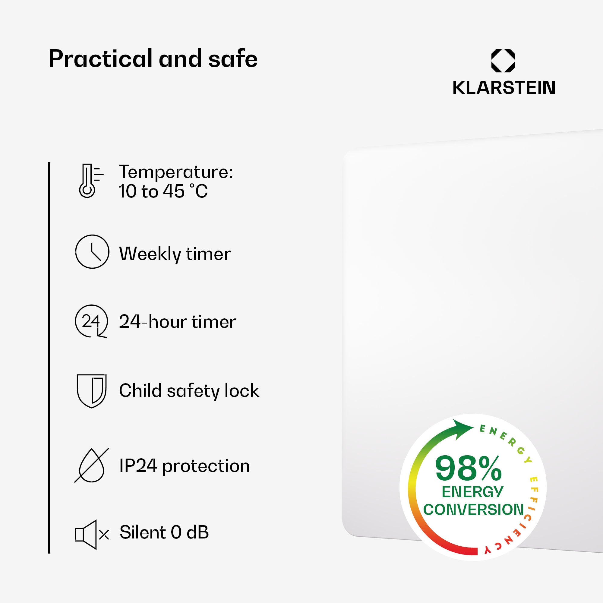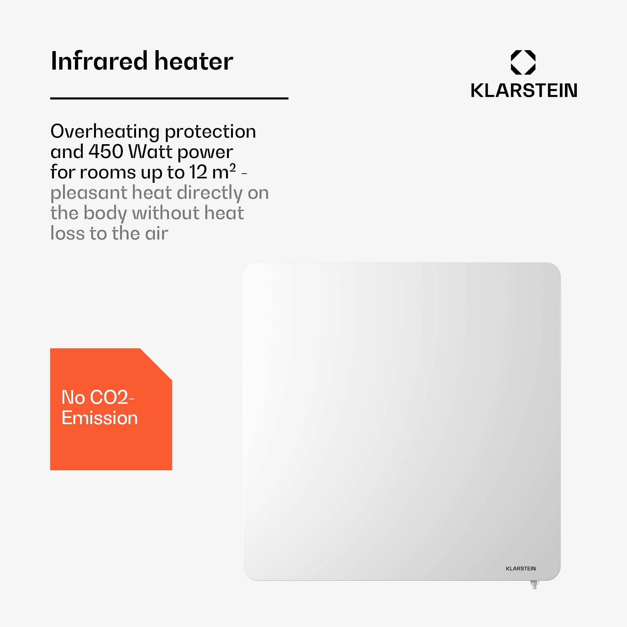 Najnovšia technológia pre príjemné teplo: Infračervený ohrievač Klarstein Wonderbeam 450 prináša príjemné teplo do každej miestnosti vysoko efektívnym a priestorovo úsporným spôsobom. Infračervený ohrievač Wonderbeam prináša revolúciu vo vykurovaní pomocou moderných technológií. Tento superplochý vyhrievací panel tenký iba 28 mm je možné priamo zavesiť na stenu, kde svoju funkciu plní mimoriadne úsporným spôsobom. Vďaka IR ComfortHeat využíva princíp solárneho tepla: namiesto pomalého ohrevu vzduchu vyžaruje príjemné infračervené tepelné lúče, ktoré priamo cielene ohrievajú ľudí a predmety v dosahu. Váš nový elektrický ohrievač je mimoriadne energeticky účinný: celých 95 % spotrebovanej energie sa premení na tepelné lúče a nedochádza k rozvíreniu prachu ani hluku. Skrytý LED displej umiestnený na boku, je obzvlášť praktický a uľahčuje nastavenie alebo ovládanie všetkých funkcií. Inteligentný vykurovací systém môžete obsluhovať aj pomocou diaľkového ovládania. Tento Infrapanel je ideálnym riešením pre moderné vykurovanie.Do ovládača je potrebné samostatne zakúpiť 1 betériu CR2025.