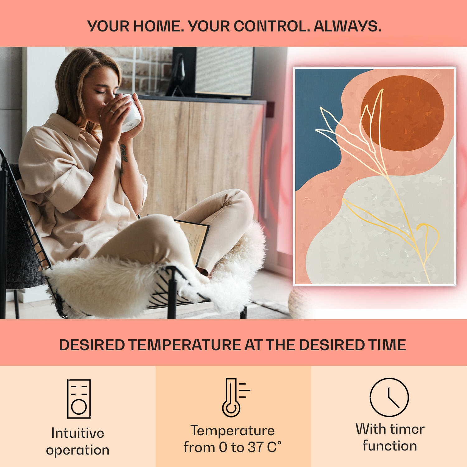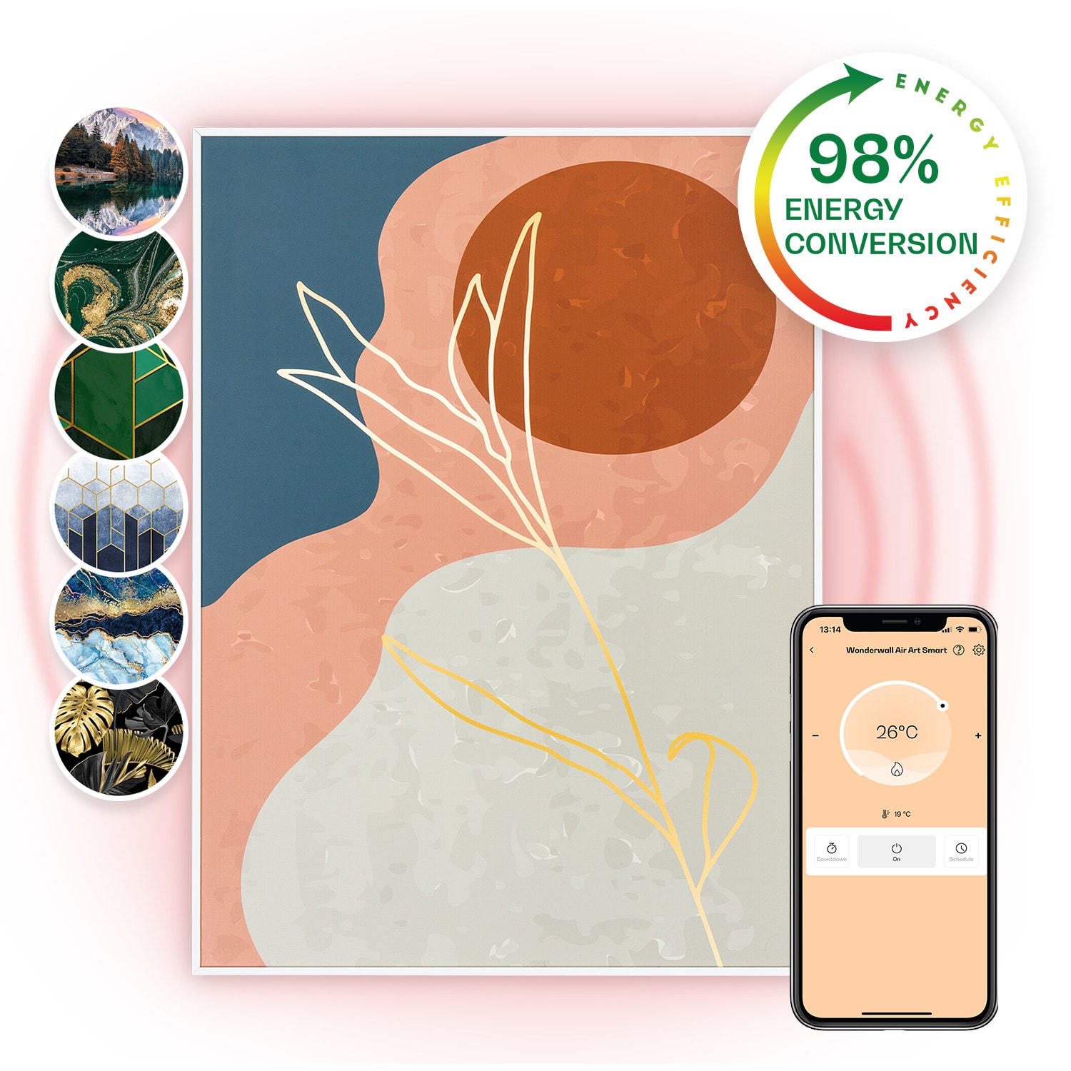 Inteligentná technológia pre príjemné teplo: Infračervený ohrievač Wonderwall Air Art Smart od Klarstein vás veľmi účinne zohreje príjemným infračerveným teplom a stane sa dekoratívnym svetlým bodom v každej miestnosti. Infračervený ohrievač Wonderwall Air Art Smart od Klarstein predstavuje revolúciu vo vykurovaní pomocou modernej technológie. Vykurovací panel je úplne plochý a môžete ho zavesiť na stenu ako Infrapanel obraz. Pomocou technológie IR ComfortHeat a výkonom 500 wattov pritom využíva princíp slnečného ohrievania: namiesto toho, aby pomaly ohrieval vzduch, vydáva príjemné infračervené teplo, ktoré priamo ohrieva osoby a objekty v oblasti približne 10 m². Váš nový elektrický ohrievač je zároveň mimoriadne energeticky účinný: celých 98 % absorbovanej energie sa nemení na tepelné žiarenie. Termostat, funkcia automatického vypnutia, týždenný časovač, tichá prevádzka a inteligentné ovládanie cez aplikáciu WiFi sofistikovane dopĺňajú inovatívnu možnosť vykurovania. Budúcnosť vykurovacej technológie: dekoratívny a efektívny infračervený elektrický ohrievač Wondewall Air Art Smart od Klarstein.