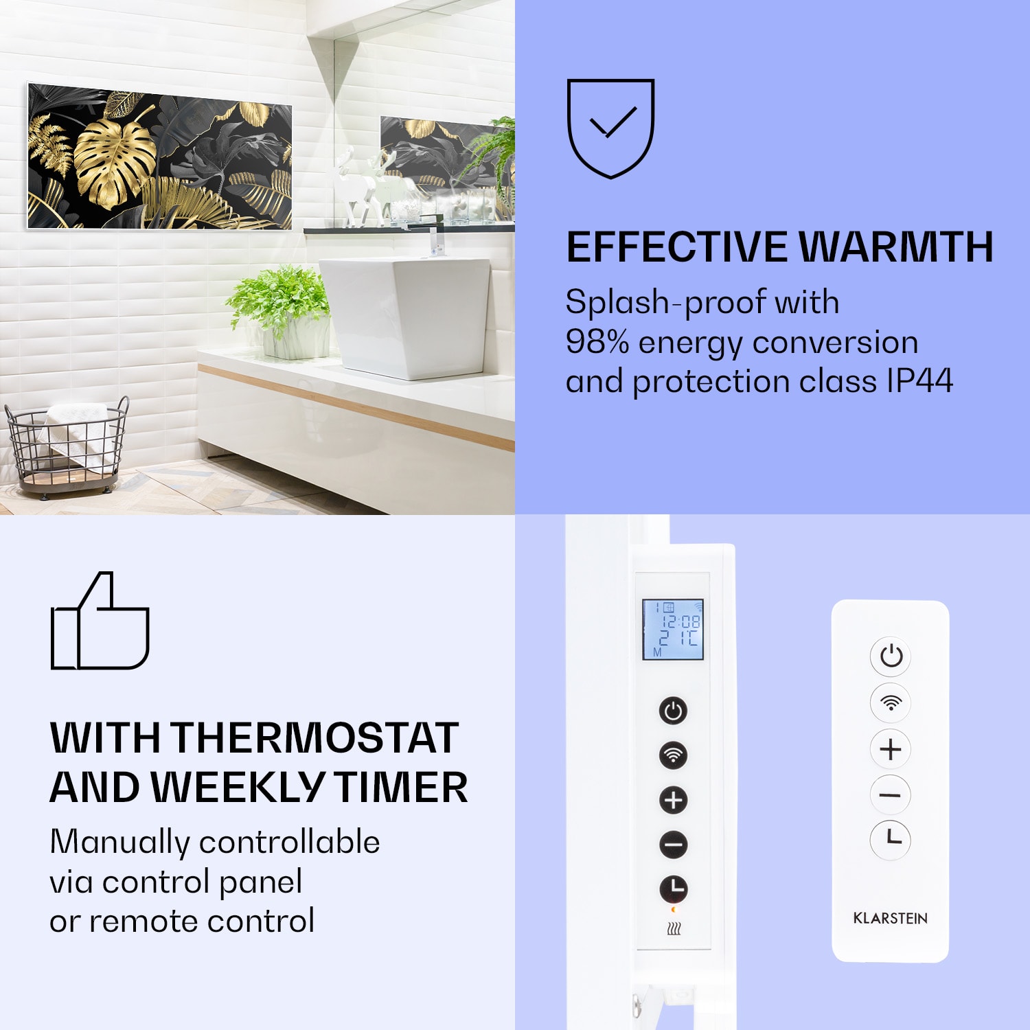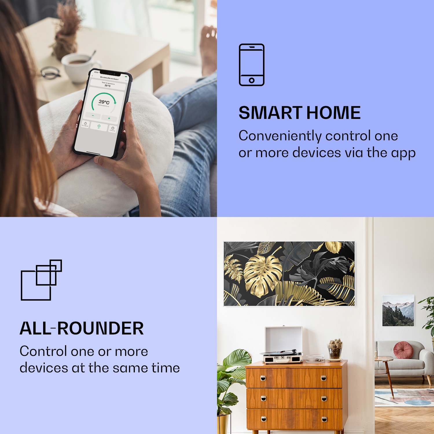 Infračervený ohrievačKlarstein Air Art Smart kombinuje vysoko efektívny vykurovací výkon s pôsobivým dizajnom a najnovšou technológiou. Prináša príjemné teplo a tiež nový lesk a farbu do každej miestnosti a pritom je energeticky veľmi efektívny a ekologický vďaka svojej infračervenej technológii. So svojím silným výkonom 700 W a vďaka technológii IR ComfortHeat šíri k ľudskej pokožke veľmi príjemné teplo, ktoré je vyžarované cielene na osoby v blízkosti ohrievača. Ovládaj veľmi jednoducho pomocou smartfónu, diaľkového ovládača alebo ovládacieho panela jeden ohrievač alebo viacero ohrievacích zariadení. Tento infrapanel obraz sa dokonale hodí do moderného interiéru. Vitaj v budúcnosti vykurovacej techniky: infračervený ohrievačKlarstein Air Art Smart.