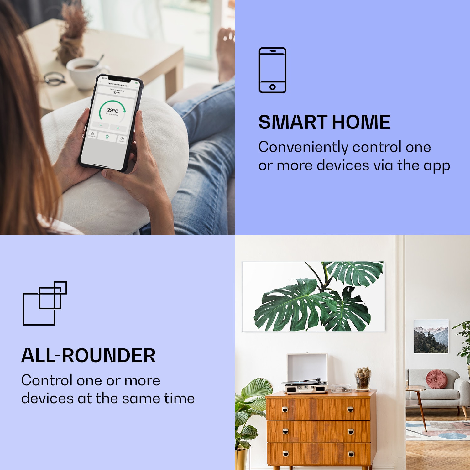 Infračervený ohrievačKlarstein Air Art Smart kombinuje vysoko efektívny vykurovací výkon s pôsobivým dizajnom a najnovšou technológiou. Prináša príjemné teplo a tiež nový lesk a farbu do každej miestnosti a pritom je energeticky veľmi efektívny a ekologický vďaka svojej infračervenej technológii. So svojím silným výkonom 700 W a vďaka technológii IR ComfortHeat šíri k ľudskej pokožke veľmi príjemné teplo, ktoré je vyžarované cielene na osoby v blízkosti ohrievača. Ovládaj veľmi jednoducho pomocou smartfónu, diaľkového ovládača alebo ovládacieho panela jeden ohrievač alebo viacero ohrievacích zariadení. Tento infrapanel obraz sa dokonale hodí do každého interiéru. Vitaj v budúcnosti vykurovacej techniky: infračervený ohrievačKlarstein Air Art Smart.