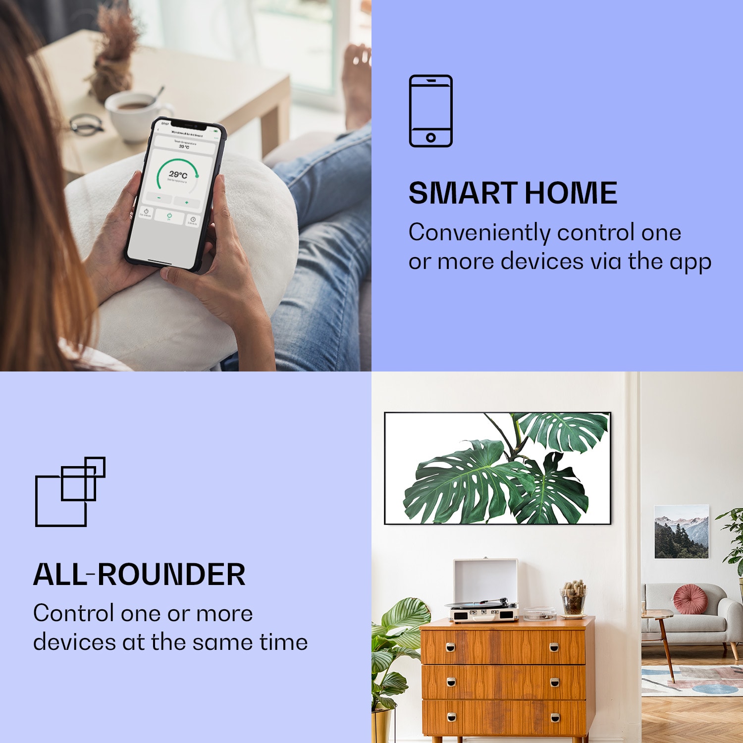Infračervený ohrievačKlarstein Air Art Smart kombinuje vysoko efektívny vykurovací výkon s pôsobivým dizajnom a najnovšou technológiou. Prináša príjemné teplo a tiež nový lesk a farbu do každej miestnosti a pritom je energeticky veľmi efektívny a ekologický vďaka svojej infračervenej technológii. So svojím silným výkonom 700 W a vďaka technológii IR ComfortHeat šíri k ľudskej pokožke veľmi príjemné teplo, ktoré je vyžarované cielene na osoby v blízkosti ohrievača. Ovládaj veľmi jednoducho pomocou smartfónu, diaľkového ovládača alebo ovládacieho panela jeden ohrievač alebo viacero ohrievacích zariadení. Tento Infrapanel obraz sa dokonale hodí do každého interiéru. Vitaj v budúcnosti vykurovacej techniky: infračervený ohrievačKlarstein Air Art Smart.