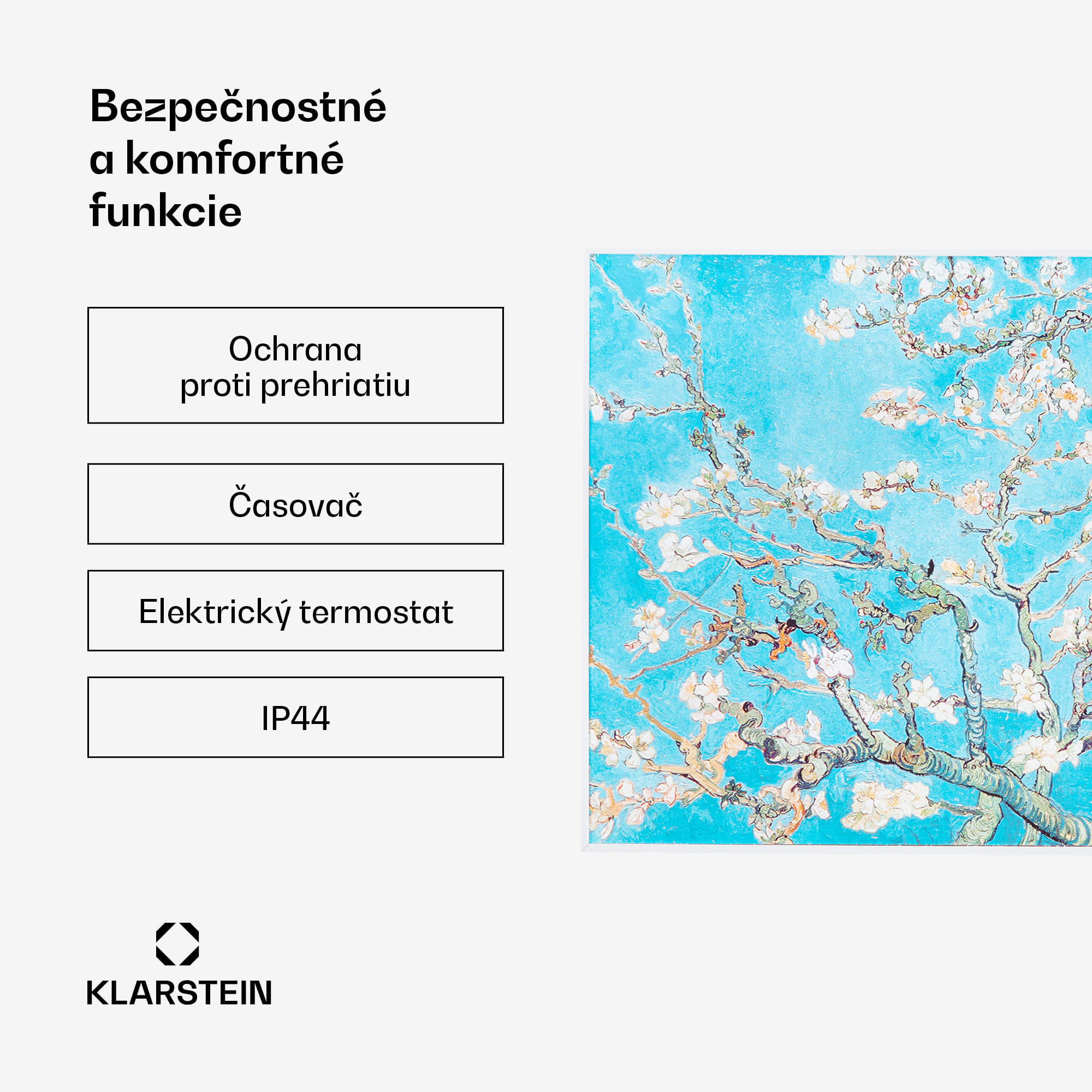 Infračervený ohrievač Klarstein Wonderwall Air Art Smart kombinuje vysoko efektívny vykurovací výkon s pôsobivým dizajnom a najnovšou technológiou. Prináša príjemné teplo a tiež nový lesk a farbu do každej miestnosti a pritom je energeticky veľmi efektívny a ekologický vďaka svojej infračervenej technológii.Začni vo svojej domácnosti revolúciu vo vykurovaní s infračerveným ohrievačom Klarstein Wonderwall Air Art Smart. Veľký vykurovací panel s rozmermi 80 x 60 cm je možné zavesiť priamo na stenu a vďaka svojej hĺbke 5 cm je sotva väčší ako zarámovaný obraz. Tento infrapanel obraz so silným výkonom 500 W a vďaka technológii IR ComfortHeat šíri k ľudskej pokožke veľmi príjemné teplo, ktoré je vyžarované cielene na osoby v blízkosti ohrievača. Vďaka infračervenej technológii je vykurovací panel mimoriadne energeticky efektívny a ekologický: celých 98 % výkonu sa premieňa na tepelné žiarenie.S termostatom a premyslenými funkciami, ako sú funkcia automatického vypnutia a detekcia otvoreného okna OpenWindow Detection, splní infračervený ohrievač aj tie najnáročnejšie požiadavky. Nastaviteľný týždenný časovač je mimoriadne šikovný, umožňuje programovanie časov kúrenia na každý deň týždni. Ďalší pokrok v nekomplikovanom a príjemnom zážitku tepla ti poskytne aplikácia Klarstein App Experience. Ovládaj jeden ohrievač alebo viacero ohrievačov úplne jednoducho pomocou smartfónu alebo dokonca svojím hlasom. Ovládanie pomocou tlačidiel je, samozrejme, tiež možné. Zariadenie Wanderwall pracuje bez ventilátora, nevíri teda prach, a preto je toto vykurovacie zariadenie ideálnou voľbou pre alergikov. Vďaka svojmu super plochému dizajnu, rýchlemu tepelnému výkonu a priestorovo úspornej nástennej montáži je ohrievač obzvlášť vhodný na použitie v kúpeľni. Preto je zariadenie Wonderwall Air Art Smart s triedou ochrany IP44 úplne chránené proti striekajúcej vode.Budúcnosť vykurovacej techniky: infračervený ohrievač Klarstein Wonderwall Air Art Smart.
