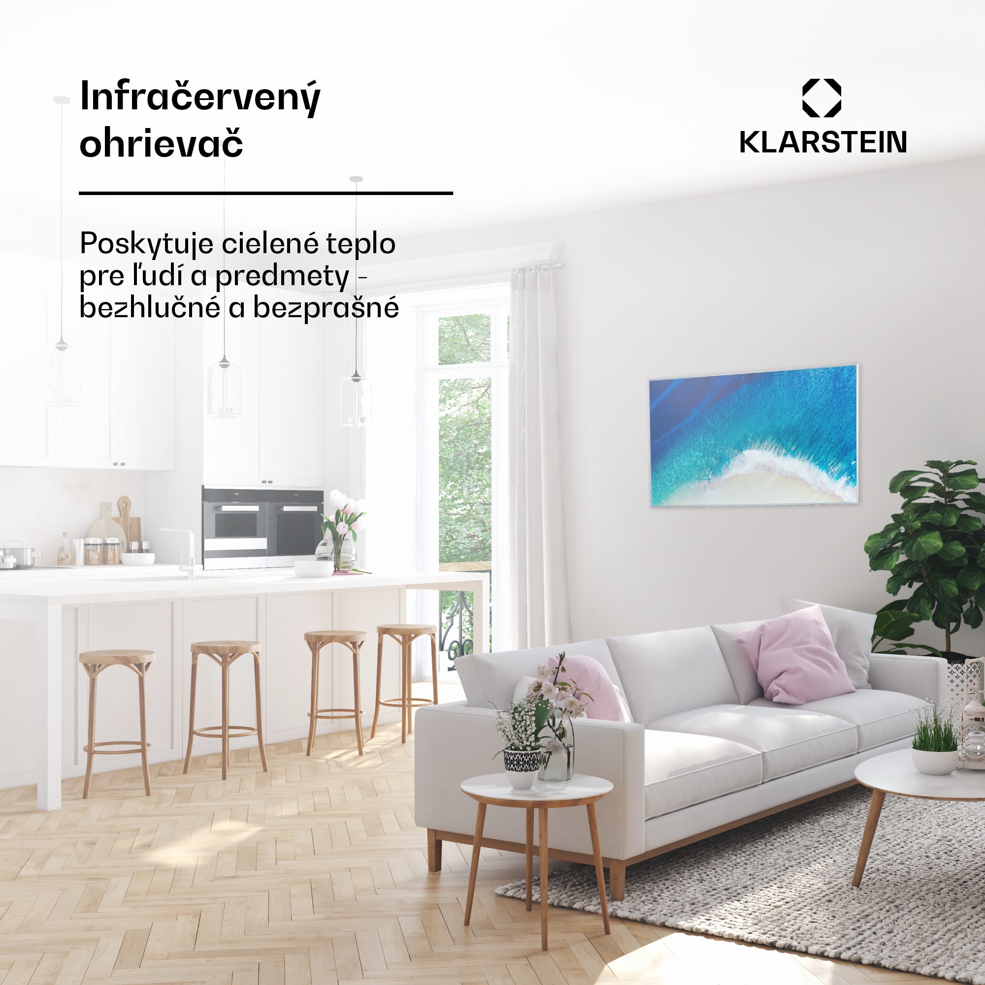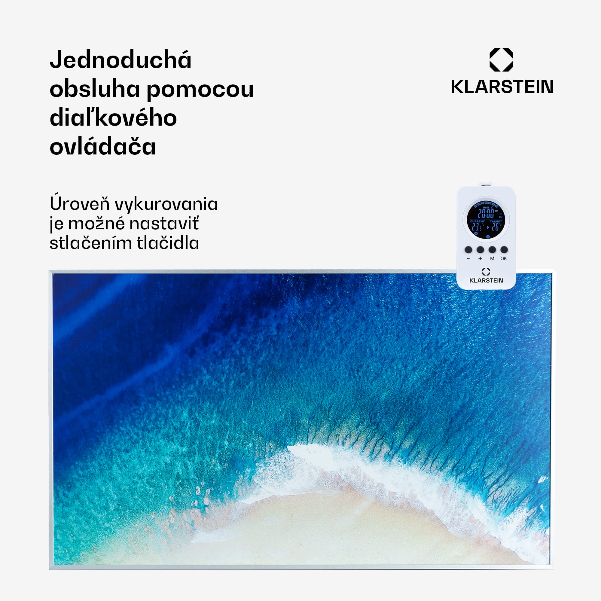 Najnovšia technológia pre príjemné teplo: infračervený ohrievač Klarstein Wonderwall Air Art Beach nielenže vyhreje každú miestnosť vysoko účinným a priestorovo úsporným spôsobom, ale zároveň dodá miestnosti nové farebné zvýraznenie vďaka povrchu s potlačou grafického dizajnu. Tento Infrapanel obraz je ideálnym doplnkom pre moderné interiéry. Veľmi plochý vyhrievací panel s rozmermi 101 x 60 cm možno zavesiť priamo na stenu odkiaľ šíri infračervené teplo, ktoré je pre ľudskú pokožku veľmi príjemné. Vďaka inovatívnej technológii IR ComfortHeat je teplo smerované na osoby v blízkosti a nie do okolia. Vyhrievací panel je mimoriadne energeticky účinný: až 98 % energie sa premieňa na sálavé teplo. Vitajte v budúcnosti vykurovacej techniky: infračervený ohrievač Klarstein Wonderwall Air Art Smart.