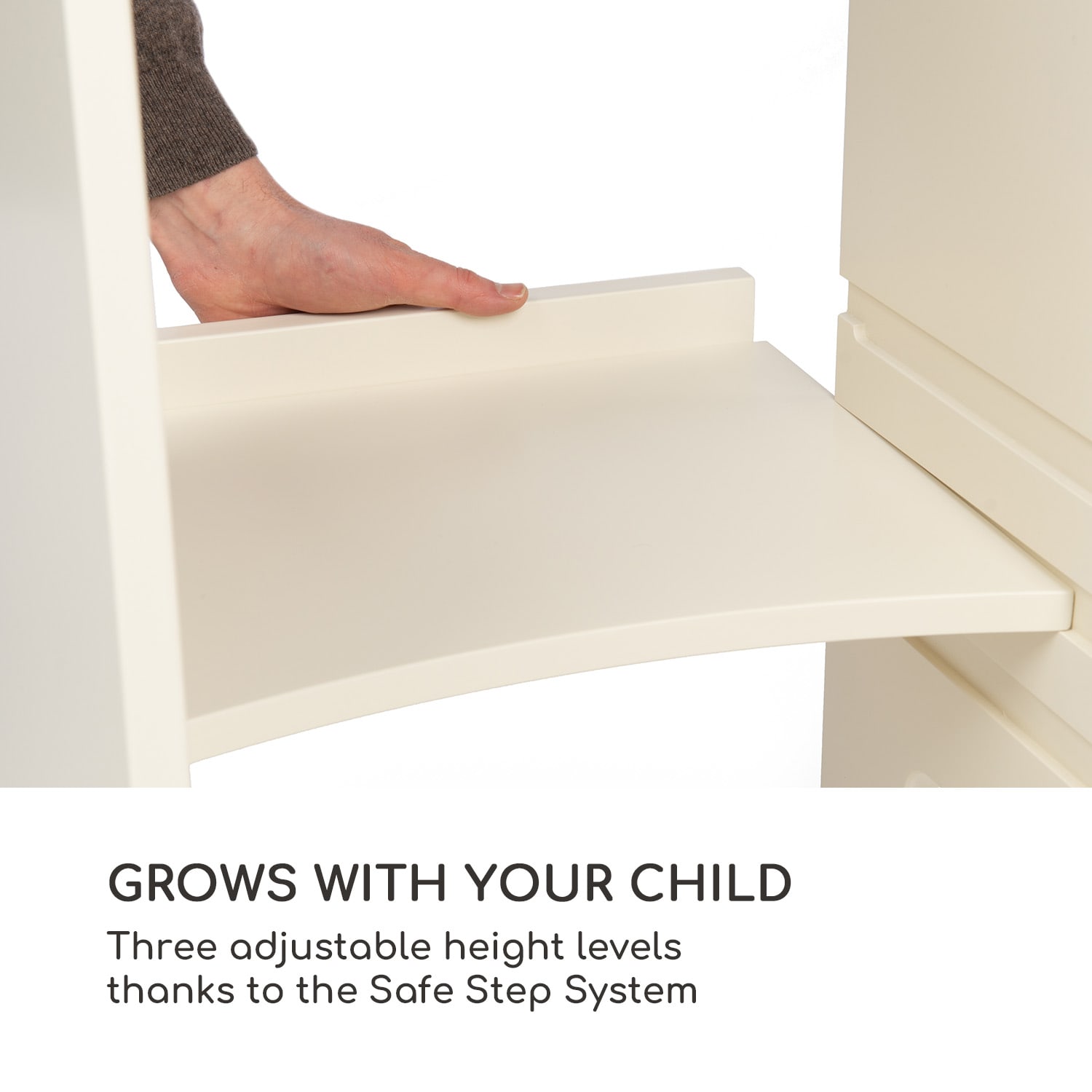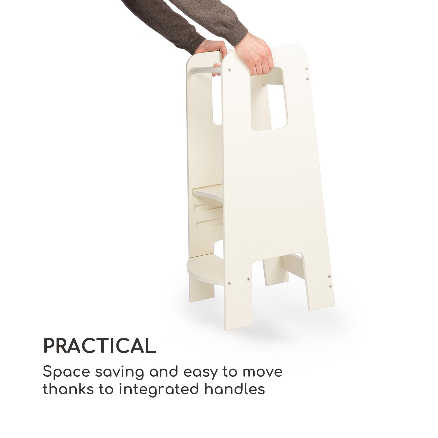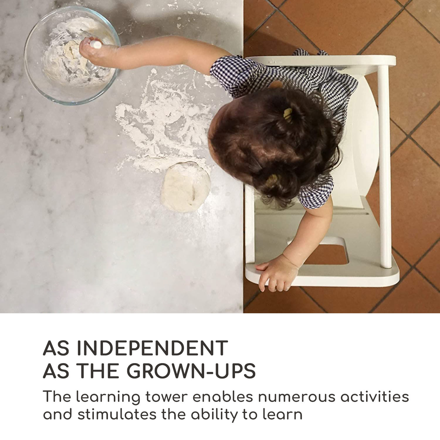 Vysoko hore a uprostred. Učiace veže blumfeldt Ully umožňujú tvojmu dieťaťu zúčastňovať sa mnohých aktivít dospelých už od jeho 12. mesiaca, napríklad v kuchyni pri varení alebo v kúpeľni pri umývaní zubov. Týmto spôsobom sa podporuje učenie samostatnosti v zmysle Montessori pedagogiky.Pomôcka na lezenie blumfeldt Ully je navrhnutá ako drevené schody a pomáha tvojmu dieťaťu dosiahnuť bezpečnú vyvýšenú polohu. Bez pomoci iných môže dieťa dočiahnuť na pracovné dosky, stoly alebo umývadlo v kúpeľni, čím je povzbudzované k samostatnosti. Bezpečnosť a pevné postavenie zabezpečujú rukoväte a zábradlie. Učiace veže sú vyrobené kompletne celé z extrémne stabilného, ​​13-vrstvového brezového multiplexu. Rohy a hrany sú starostlivo zaoblené. Plochu na státie je možné zasunúť v troch úrovniach – vo výške 28, 34 a 40 cm – a nechať tak lezeckú vežu rásť spolu s tvojím dieťaťom.
