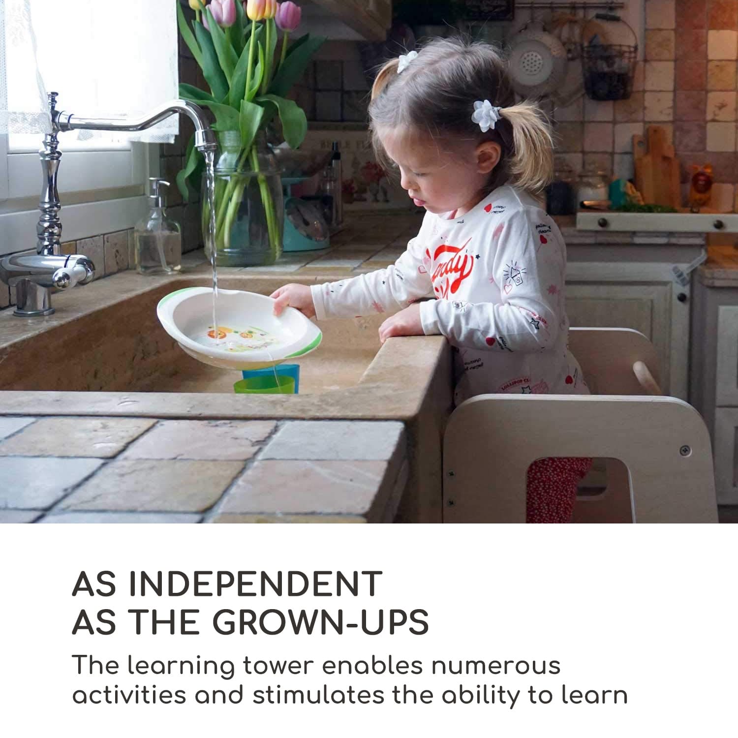 Vysoko hore a uprostred. Učiace veže blumfeldt Ully umožňujú tvojmu dieťaťu zúčastňovať sa mnohých aktivít dospelých už od jeho 12. mesiaca, napríklad v kuchyni pri varení alebo v kúpeľni pri umývaní zubov. Týmto spôsobom sa podporuje učenie samostatnosti v zmysle Montessori pedagogiky.Pomôcka na lezenie blumfeldt Ully je navrhnutá ako drevené schody a pomáha tvojmu dieťaťu dosiahnuť bezpečnú vyvýšenú polohu. Bez pomoci iných môže dieťa dočiahnuť na pracovné dosky, stoly alebo umývadlo v kúpeľni, čím je povzbudzované k samostatnosti. Bezpečnosť a pevné postavenie zabezpečujú rukoväte a zábradlie. Učiace veže sú vyrobené kompletne celé z extrémne stabilného, 13-vrstvového brezového multiplexu. Rohy a hrany sú starostlivo zaoblené. Plochu na státie je možné zasunúť v troch úrovniach – vo výške 28, 34 a 40 cm – a nechať tak lezeckú vežu rásť spolu s tvojím dieťaťom.