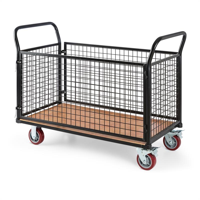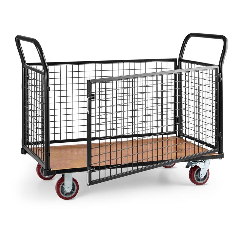 Pre Waldbeck Loadster mriežkový pojazdný vozík sú problémy s prepravou v sklade alebo logistickej oblasti detskou hračkou. Prevedenie z 3,8 cm hrubej oceľovej rúrky s čelnými a bočnými stenami zo spleti drôtenej mreže je extrémne stabilné a s ľahkosťou zdolá náklad až do 500 kg. Aj masívna podlahová doska z 3,4 cm hrubého, vodeodolného, zglejeného multiplex dreva sa nenechá ťažkým nákladom vyviesť z rovnováhy. Kompletný rám ako aj mriežkované časti sú potreté práškovou vrstvou, ktorá vozík chráni pred koróziou a škrabancami. 120 x 65 cm veľká nákladná plocha skladového vozíka Waldbeck Loadster je nanajvýš vhodná na ľahkú prepravu nepraktických a veľkých balíkov. Mriežkované steny umožňujú bezpečnú výšku nákladu do 61,5 cm bez toho, aby Vám náklad počas cesty vypadol z vozíka von. To zodpovedá nákladnému objemu skoro jedného metra kubického. Pre jednoduché naloženie transportného vozíka je možné buď odklopiť bočné steny v pántoch alebo jednoduchým pohybom ruky ich zodvihnúť. Po dva posuvné háky zabezpečujú bočné steny v ráme. Pre pohyb s ľahkým chodom disponuje ručný vozík štyrmi gumenými kolieskami s priemerom 15,3 cm a hrúbkou 5,4 cm. Dve z týchto koliesok sú pevné blokovacie kolieska a dve sú otočné o 360° so zabezpečovacou brzdou. Červené gumené kolieska vozíka Waldbeck Loadster nezanechávajú ani pri ťažkých nákladoch alebo razantnej ceste v zákrutách žiadne škaredé stopy na podlahe. Prosím, majte na vedomí, že sa pojazdný vozík dodáva ako montážna sada. Je možné ho zložiť pomocou šikovných remeselných rúk v priebehu 30 minút.