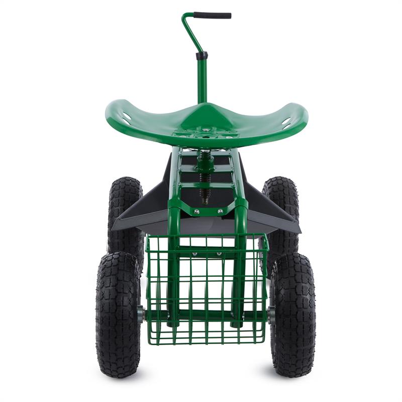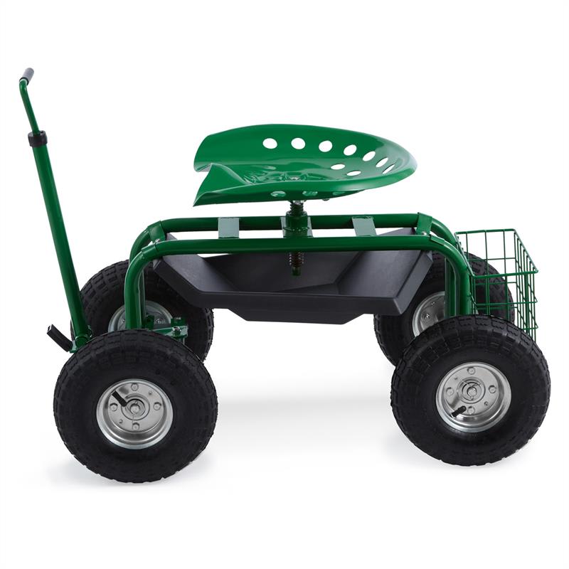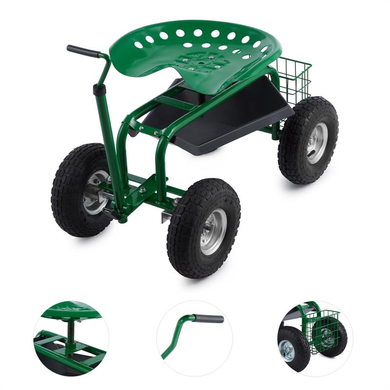 Záhradná práca na kolesách: Záhradná sedačka Waldbeck Park Ranger odbremeňuje kolená a chrbát pri práci v záhrade. Praktická záhradná sedačka Waldbeck Park Ranger sa skladá z pohodlného sedadla, rámu z robustnej ocele a štyroch širokých pneumatík. Tak vybavíte pohodlne po sediačky strihanie živého plota, oberanie bobuľových kríkov či maľovanie plota. Pracovné sedadlo Vám automaticky umožňuje zaujať šetrný postoj chrbtice pri práci, ktorú by ste museli bez stoličky vykonať v polohe v drepe alebo zhrbený. Pre optimálne pracovné podmienky sa dá výška sedadla individuálne prispôsobiť. Okrem toho je sedačka otočná o 360°, a teda ešte flexibilnejšia pri manipulácii. Pomocou oja sa dá zariadenie jednoducho ťahať z bodu A do bodu B. Zvlášť praktický je priestranný úložný priestor pod sedadlom. Dajú sa do neho umiestniť záhradné náradie, farba alebo vytrhaná burina. Nemusíte dlho hľadať a máte všetky potrebné nástroje ihneď po ruke. Akonáhle chcete začať pracovať, zablokujete rukoväť a budete stáť pevne a bezpečne na jednom mieste. Nikdy nebolo záhradníčenie také pohodlné ako so záhradnou sedačkou Waldbeck Park Ranger.