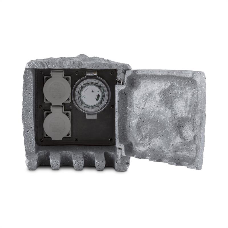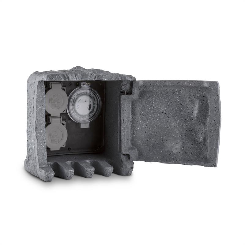 Tiež ste unavení z neustáleho používania predlžovacieho kábla v záhrade na kosenie trávnika, pre elektrický gril alebo na osvetlenie večernej párty? So zásuvkou v kameni Timer Rock od spoločnosti Waldbeck s tým možno skoncovať. Za pekným, tmavosivým kameňom z umelého kameňa sa skrývajú dve zásuvky s ochranným kontaktom (IP44), ktoré ukončia otravné ťahanie káblov. Odolný voči striekajúcej vode a zime je vhodný pre trvalú inštaláciu v záhrade ako zdroj energie pre rôzne elektrické zariadenia. S celkovým výkonom až 3680 W je rozdeľovač k dispozícii pre súčasné zásobovanie prúdom pre kosačku aj pílu. Zariadenie Timer Rock má zabudované spínacie hodiny, ktoré možno naprogramovať v intervaloch po 15 minút. To umožňuje zapnutie a vypnutie elektrických spotrebičov, ako sú ohrievače v skleníkoch, polievacie zariadenie, aj v prípade neprítomnosti. Spínacie hodiny a zásuvky sú umiestnené za sklápacími dvierkami zariadenia Timer Rock, ktoré zostávajú bezpečne uzatvorené vďaka magnetickému uzáveru. Štyri výrezy na spodnej hrane sklápacej hrany zaisťujú priechod káblov Vašich zariadení. Aby kmeň neodniesli závistliví susedia, dá sa jednoducho priskrutkovať k chodníkovým dlaždiciam alebo múrom. Potrebný montážny materiál je hneď dodávaný. Aby niekto počas Vašej neprítomnosti nepoužíval Váš prívod prúdu, dá sa 5 m kábel dekoratívnej zásobárne energie Waldbeck bez problémov odpojiť. Zariadenie Waldbeck Timer Rock je nielen užitočné, je aj ozdobou záhrady. Z materiálu umelého kameňa je vymodelovaný tmavý žulový blok, ktorý sa začlení ako skrášlenie do záhonu alebo trávnika. Vezmite, prosím, na vedomie, že máme k dispozícii aj zásuvky v kameni aj vo forme 4-itého rozdeľovača bez spínacích hodín.