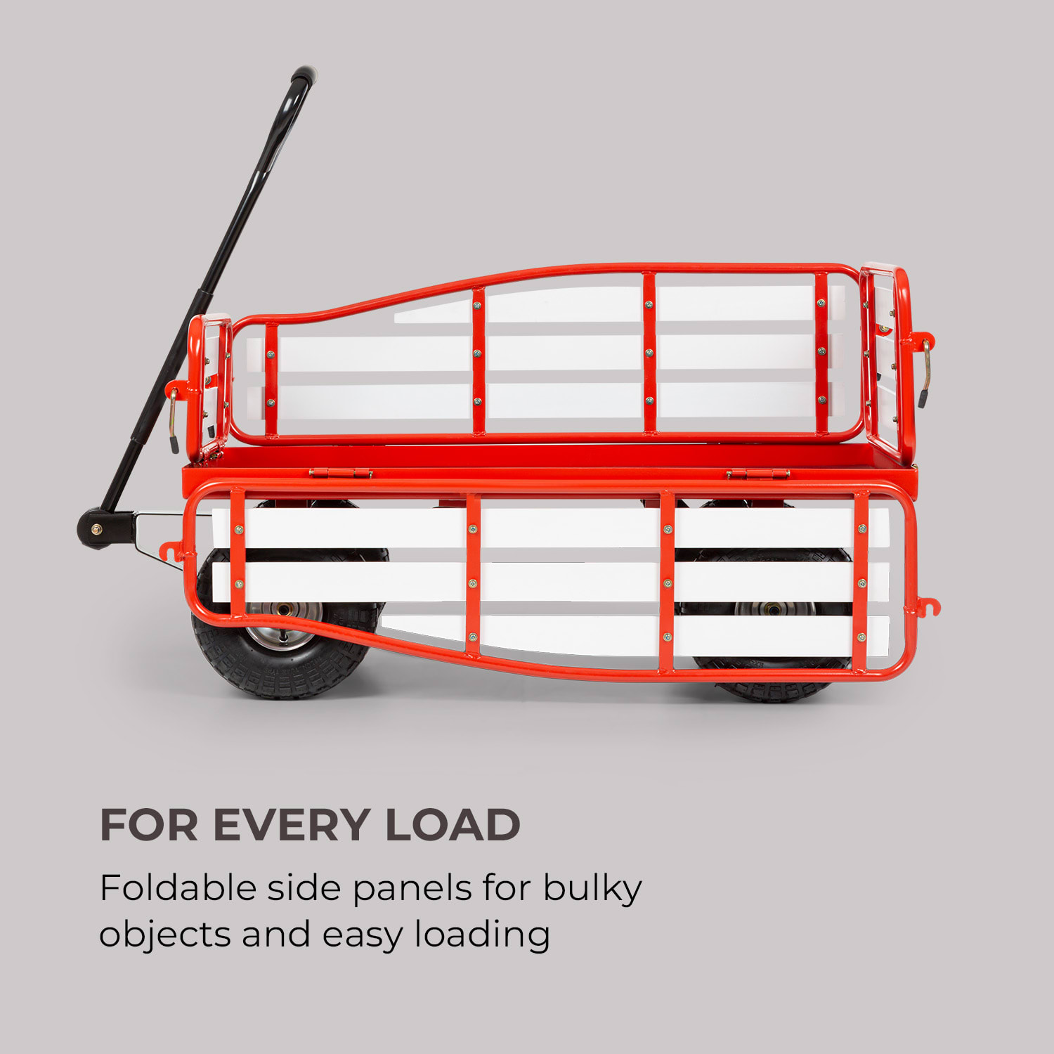 Ručný vozík Waldbeck Ventura je veľmi praktický pomocník pri práci v záhrade, pri preprave rozmerných alebo ťažkých predmetov a samozrejme pri nákupe alebo výletoch do prírody. Chcete posadiť živý plot alebo si vytvoriť ešte farebnejší kvetinový záhon? Ventura je ten správny partner. Môžete s ním bez námahy prepravovať všetko potrebné záhradné náradie aj rastliny. A počas doby po práci nájdu svoje miesto na nakladacej ploche s rozmerom 100 x 50 cm aj gril a prepravky s nápojmi!Ručný vozík Waldbeck Ventura má robustnú konštrukciu z čierneho lakovaného kovu. Stabilné bočné diely z drevoplastového materiálu WPC (wood-plastic-composite) držia náklad, vozíku dávajú zaujímavý vzhľad a sú odolné voči plesni. Šikovné, 75 cm dlhé oje s opláštenou rukoväťou uľahčuje ťahanie vozíka. Extra široké pneumatiky s hrúbkou 9 cm umožňujú ľahký pohyb aj v piesku alebo blate. Bočné diely sa dajú pomocou niekoľkých jednoduchých krokov sklopiť, takže vozík sa naplní ešte jednoduchšie a tiež je vďaka tomu možné prevážať veľké, objemné predmety. So sklopenou bočnou stranou môže vozík okrem toho fungovať ako záhradné sedadlo. Taká jednoduchá a pohodlná práca v záhrade nebola ešte nikdy. Aj mimo Vašej zelenej oázy je vozík pre ťažké náklady Ventura od spoločnosti Waldbeck užitočné nákladné vozidlo. Preváža ťažké debny vody, veľké nákupy a každý ťažký náklad, kam chcete, pretože vozík je možné zaťažiť hmotnosťou až do 300 kg.Či už piknik, nákup, práca v záhrade, alebo nákladná preprava:  ručný vozík Waldbeck Ventura prenesie každý náklad bezpečne do cieľa!