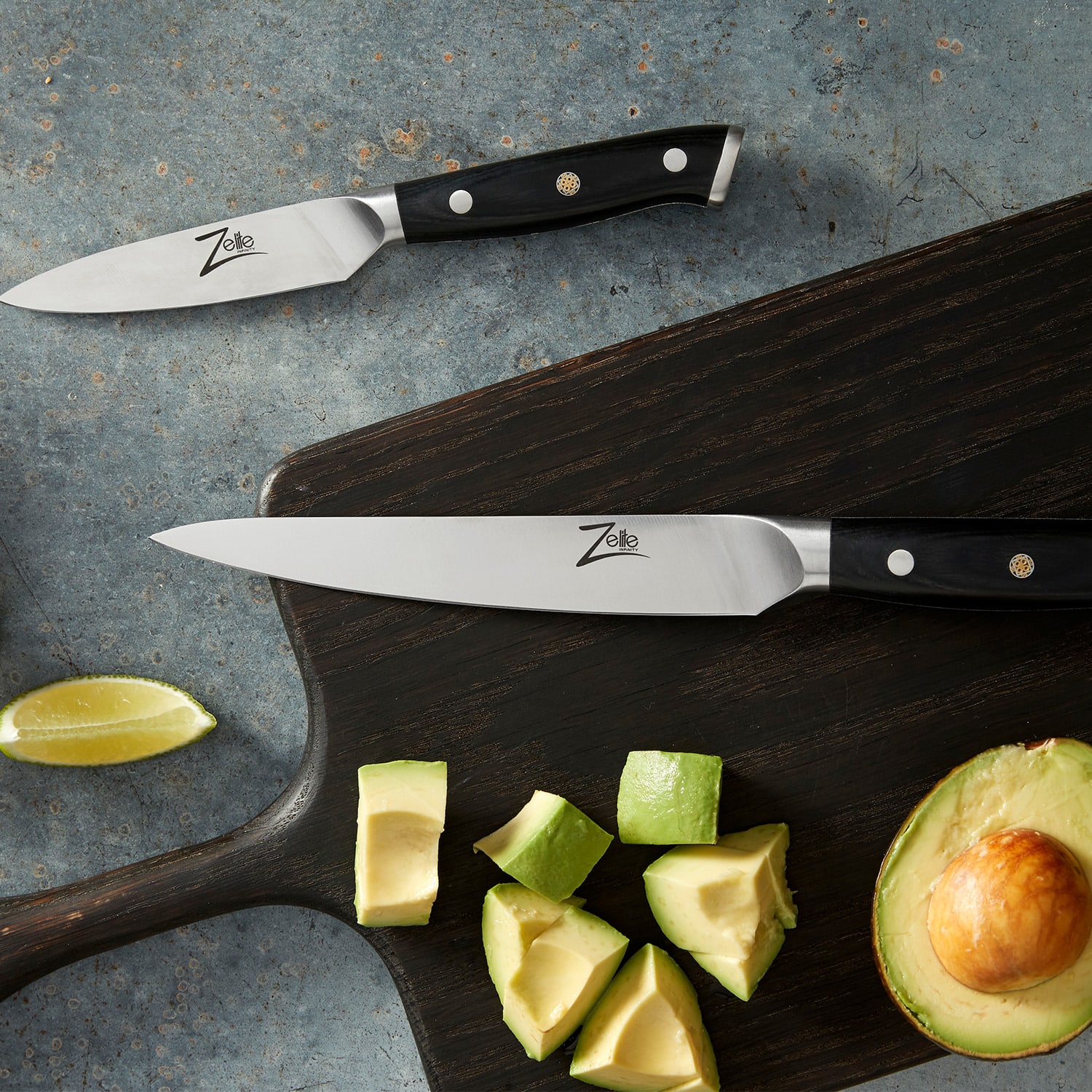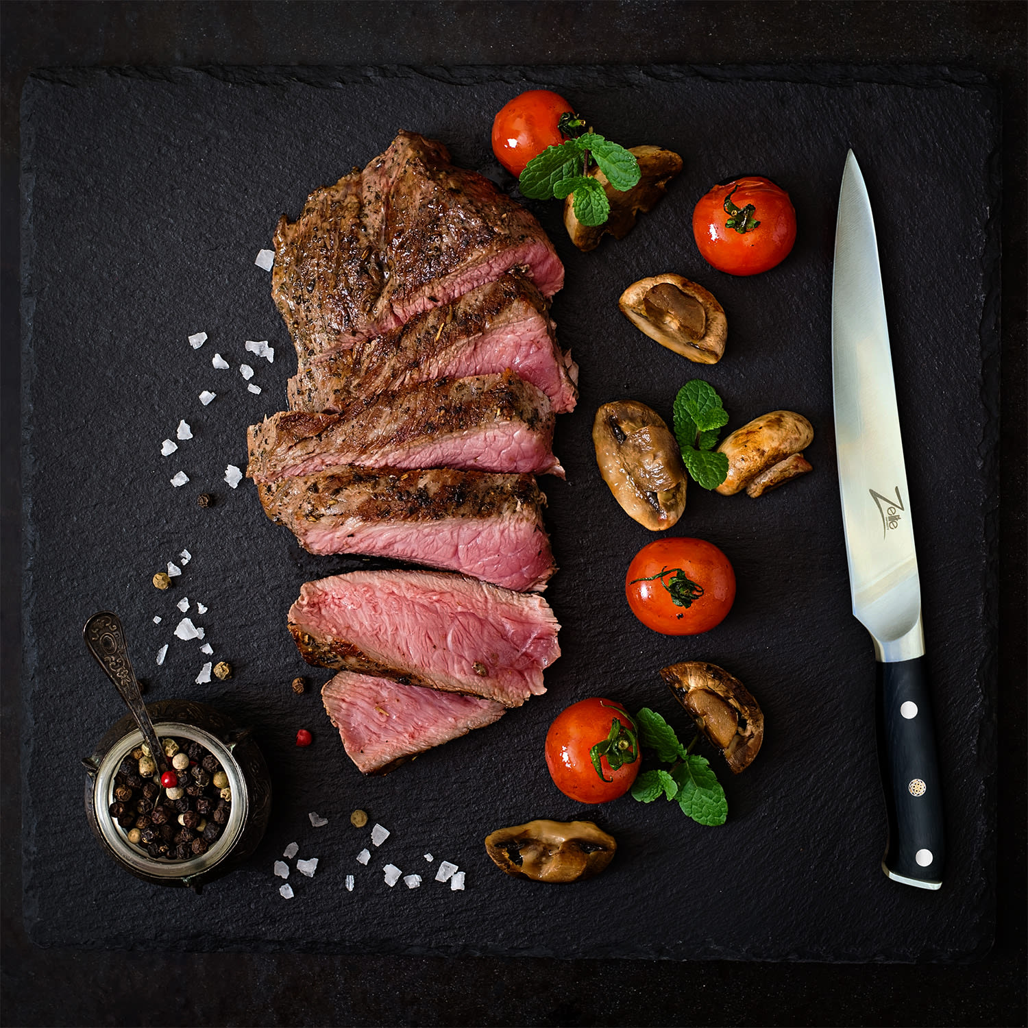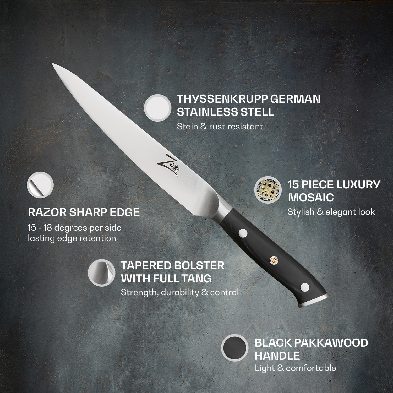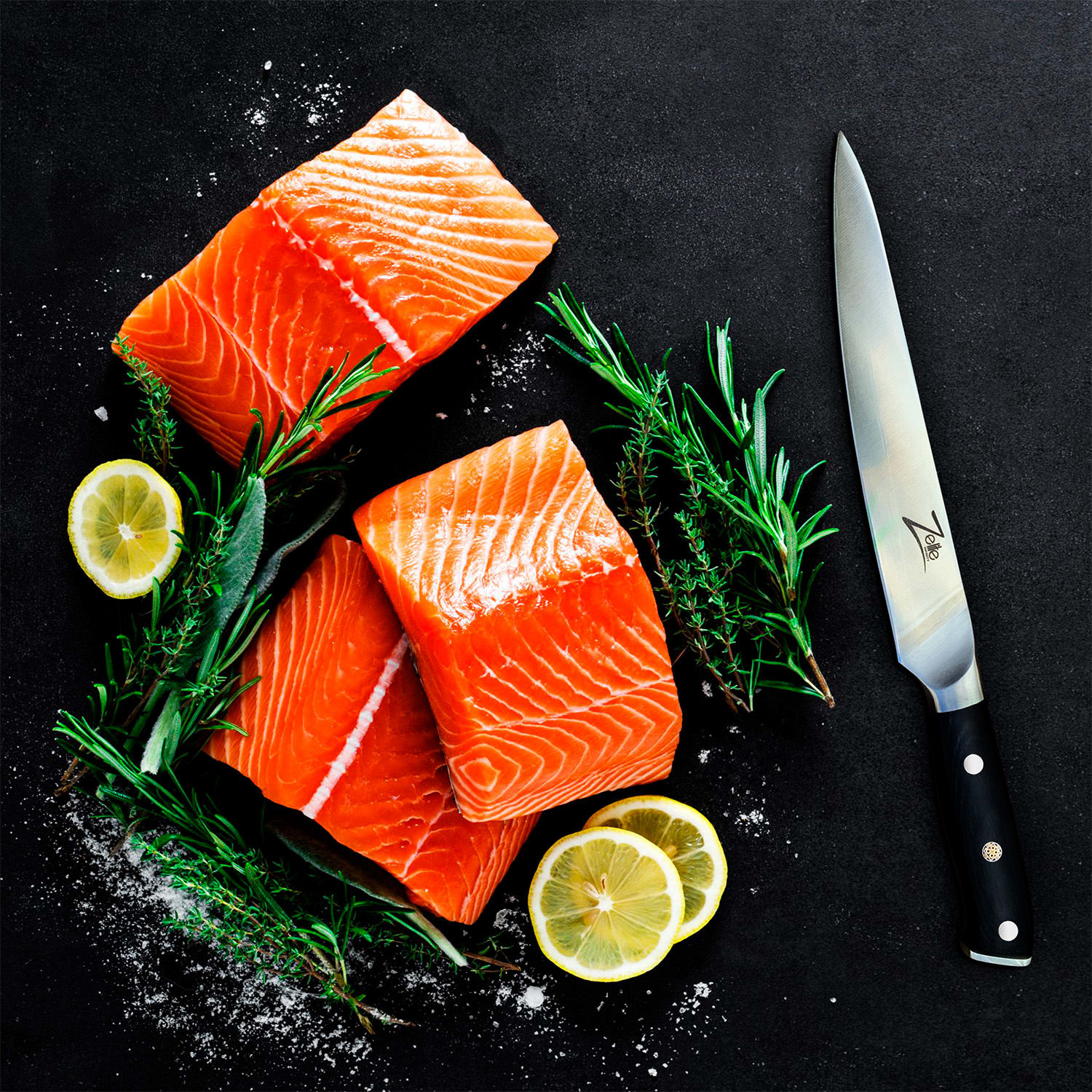 Dobré a ostré nože sú nevyhnutnosťou pre profesionálnych kuchárov a všetkých, ktorí sa radi venujú svojej kuchyni. Naša nemecká séria nožov Alpha-Royal od Zelite Infinity by Klarstein spája vysokokvalitné materiály, dokonalé spracovanie a elegantný dizajn a vytvára precízne nástroje, ktoré vás budú inšpirovať pri každodennom varení. Sada steakových nožov je vyrobená z kvalitnej nemeckej nehrdzavejúcej ocele Thyssenkrupp a čierneho materiálu G-10. Ergonomické rukoväte s tromi nitmi majú mozaikový vzor a pri rezaní dobre a bezpečne padne do ruky. Štvordielna súprava nožov Alpha-Royal German obohatí vaše kuchynské vybavenie alebo je skvelým darčekom pre priateľov či rodinu. Každý steakový nôž sa navyše dodáva s koženým puzdrom.