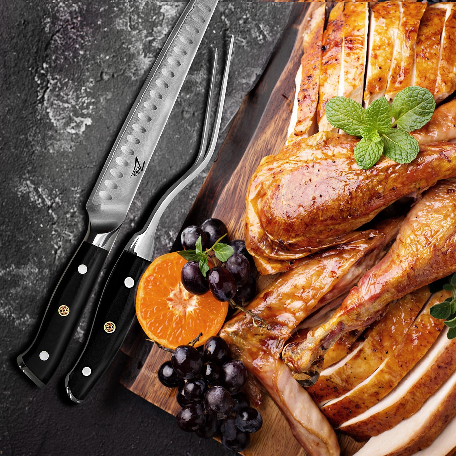 Exkluzívne a precízne nože podľa japonského vzoru: ručne brúsená séria nožov Zelite Infinity by Klarstein Alpha-Royal Japanese spĺňa vysoké nároky každého kuchárskeho umenia. Menistú čepeľ tvorí celkovo 67 vrstiev veľmi kvalitnej japonskej damaškovej ocele. Vďaka svojmu perfektne vyváženému a ergonomickému tvaru a hladkej rukoväti zo skleného vlákna G10 s tromi nitmi sedí tento elegantný kuchynský nástroj dokonale v ruke. Spája sa tu ostrosť, odolnosť, hmotnosť, ovládanie a manipulácia s výnimočným dizajnom, ktoré sú zdokonalené 3 umeleckými kovovými mozaikovými nitmi v rukoväti.Tranžíruj ako šéfkuchár: 10″ tranžírovací príbor zo série Zelite Infinity by Klarstein Alpha-Royal Japanese ti poskytne kvalitné kuchynské nástroje s prekrásnym dizajnom. S ľahkosťou a priamym pohybom sa ti podaria hladké rezy mäsa, zatiaľ čo pomocou vidličky s dlhými hrotmi môžeš pevne uchopiť moriaka, hovädziu hruď, jahňacie koleno alebo šunku. Extra ostrý nôž Granton ti umožní narezať mäso na tenučké plátky, pričom mäso sa neprilepí na ostrie vďaka špeciálnemu výbrusu.