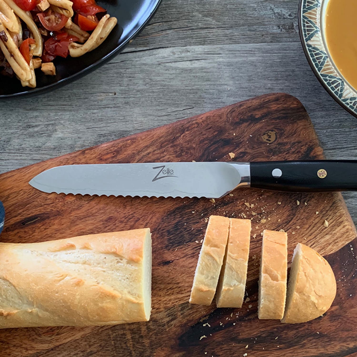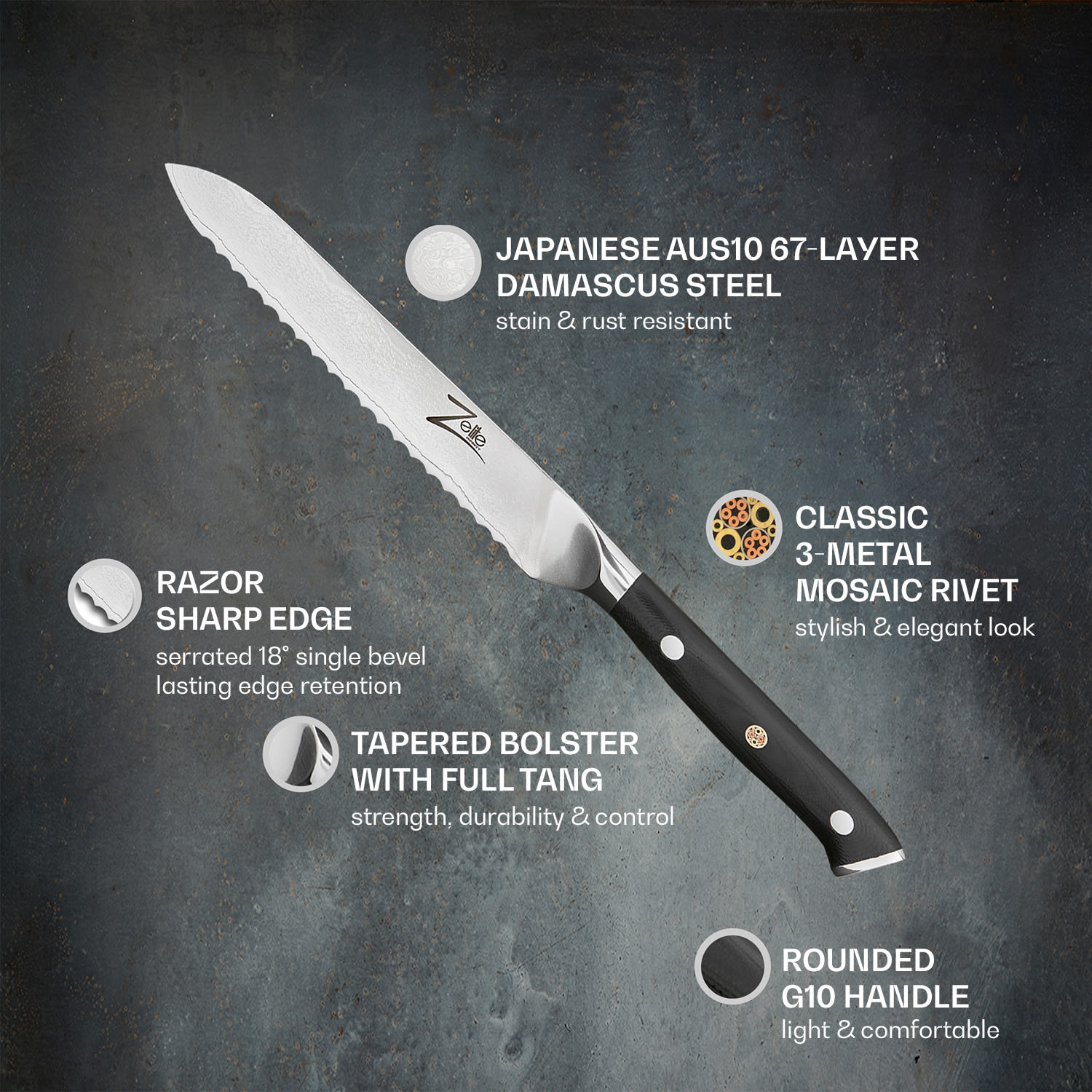 Exkluzívne a precízne nože podľa japonského vzoru: ručne brúsená séria nožov Zelite Infinity by Klarstein Alpha-Royal Japanese spĺňa vysoké nároky každého kuchárskeho umenia. Menistú čepeľ tvorí celkovo 67 vrstiev veľmi kvalitnej japonskej damaškovej ocele. Vďaka svojmu perfektne vyváženému a ergonomickému tvaru a hladkej rukoväti zo skleného vlákna G10 s tromi nitmi sedí tento elegantný kuchynský nástroj dokonale v ruke. Spája sa tu ostrosť, odolnosť, hmotnosť, ovládanie a manipulácia s výnimočným dizajnom, ktoré sú zdokonalené 3 umeleckými kovovými mozaikovými nitmi v rukoväti.Podoba elegantného noža na chlieb, použiteľnosť talentovaného všestranného noža: 5,5″ univerzálny nôž so zúbkovaným okrajom má extra ostrú, zúbkovanú čepeľ. Vďaka tomu ideálne zachytí každý povrch a rozreže akúkoľvek surovinu bez veľkej námahy – od mäkkej zeleniny cez chrumkavú kôrku chleba alebo šupku až po jemné koláče s ovocím a posýpkou. Bez ohľadu na to, aké potraviny a suroviny chceš pokrájať, tento elegantný univerzálny nôž je v tvojej ruke výborným pomocníkom.