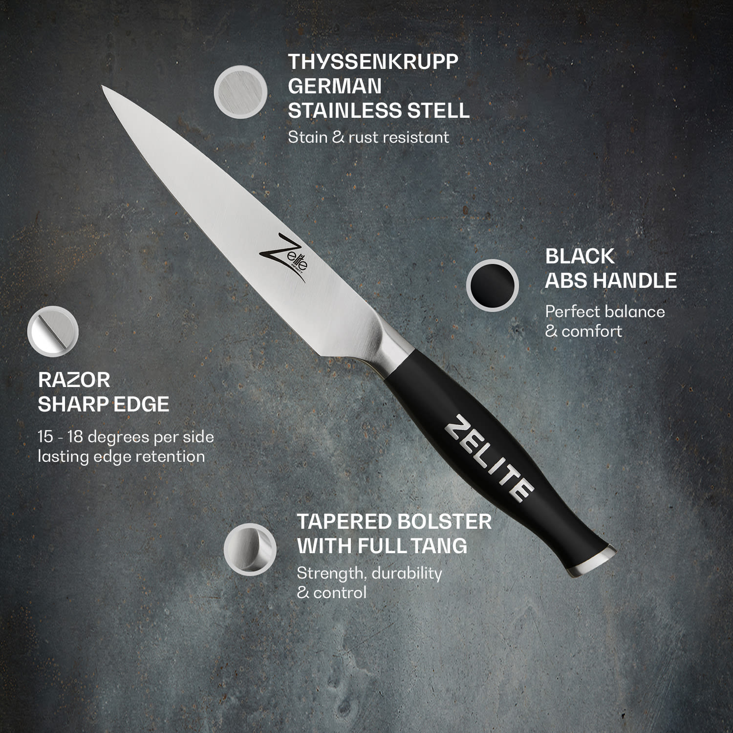 Dokonalé nože pre hobby kuchárov, profesionálov v kuchyni a všetkých, ktorí majú radi ostré nože! Séria nožov Zelite Infinity by Klarstein Comfort Pro kombinuje extrémnu ostrosť, vysokú kvalitu a jednoduchú manipuláciu s elegantným vzhľadom a zjednodušuje krájanie, sekanie alebo lúpanie. Čepele z kvalitnej nemeckej nehrdzavejúcej ocele od spoločnosti Thyssenkrupp sú tvrdé, flexibilné a ostré ako britva. Vďaka prechodu od čepele k záštite bez hrán a štrbín a tiež vďaka ergonomickej rukoväti s perfektným vyvážením sedia dobre v ruke a umožňujú dokonale presné krájanie.5″ univerzálny nôž Zelite Infinity by Klarstein Comfort Pro je mimoriadne vhodný na lúpanie a krájanie ovocia a zeleniny, napríklad citrusového ovocia, ale tiež s ľahkosťou pokrája mäso a syr, akoby krájal maslo. Doplň svoje kuchynské nože alebo ho použi ako perfektný darček pre priateľov, ktorí radi varia.